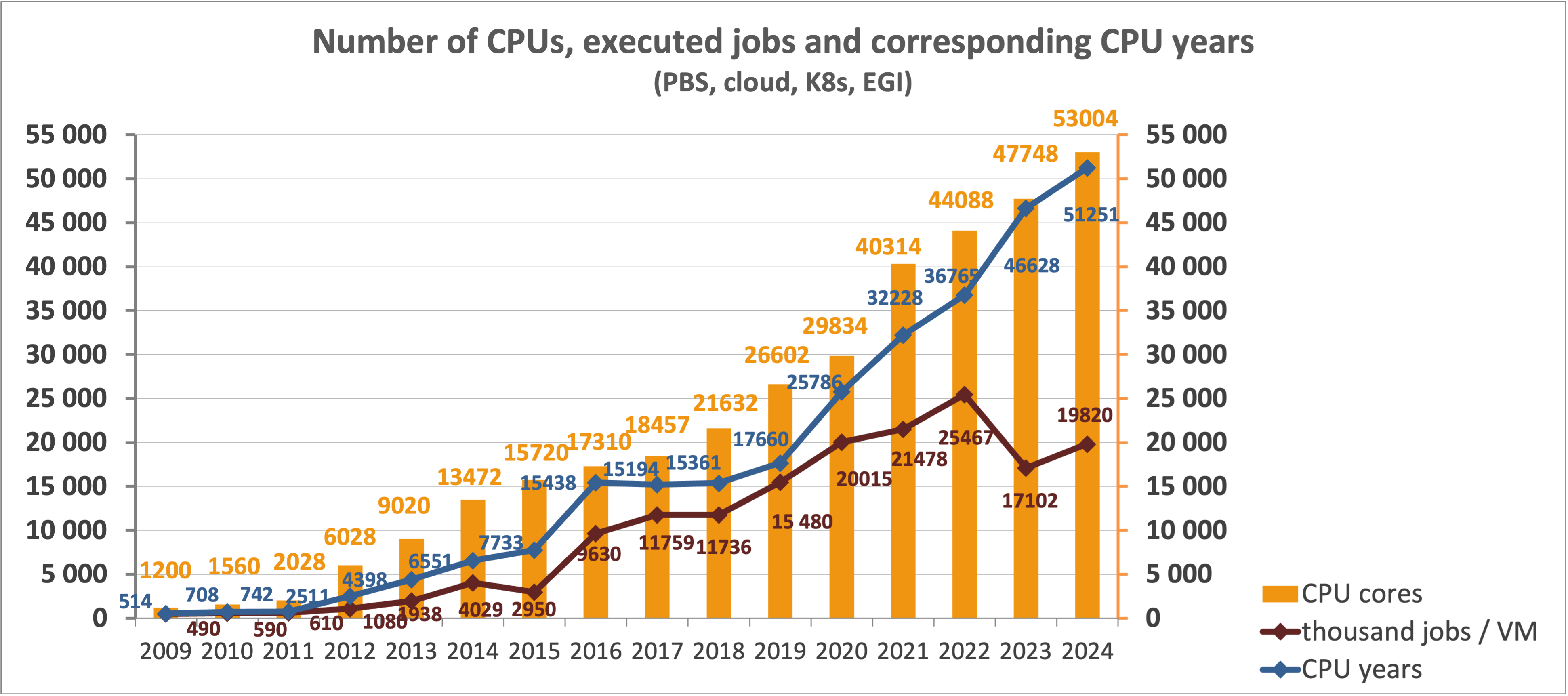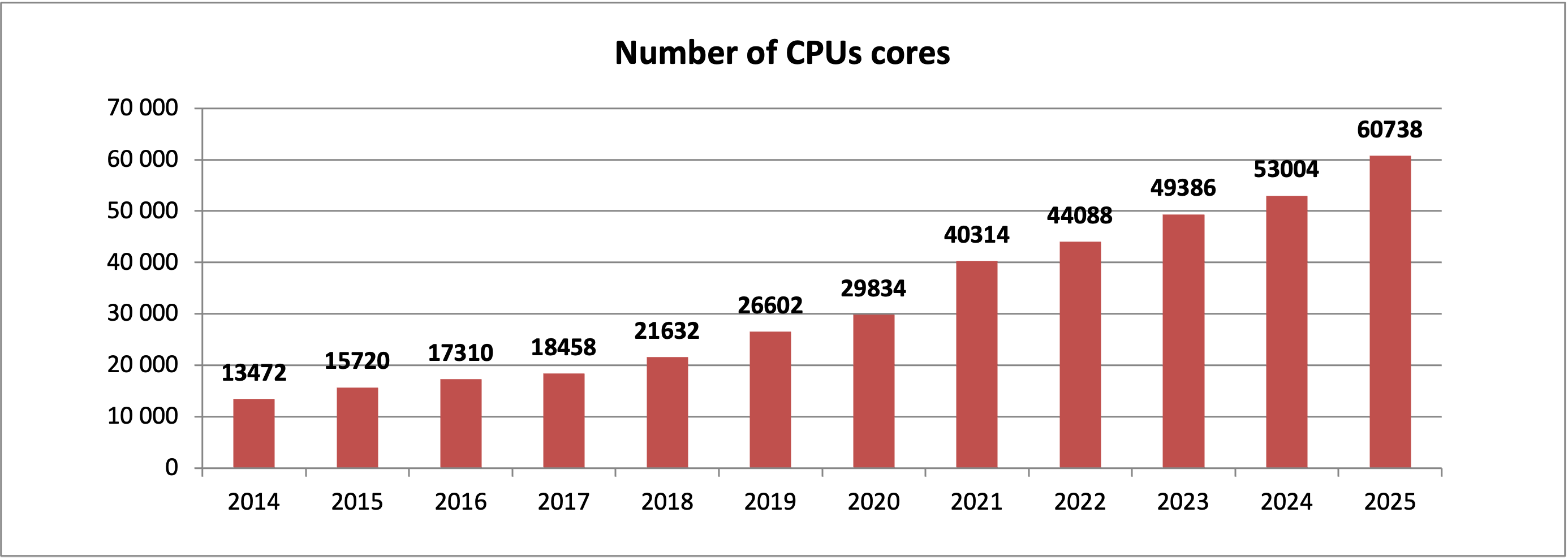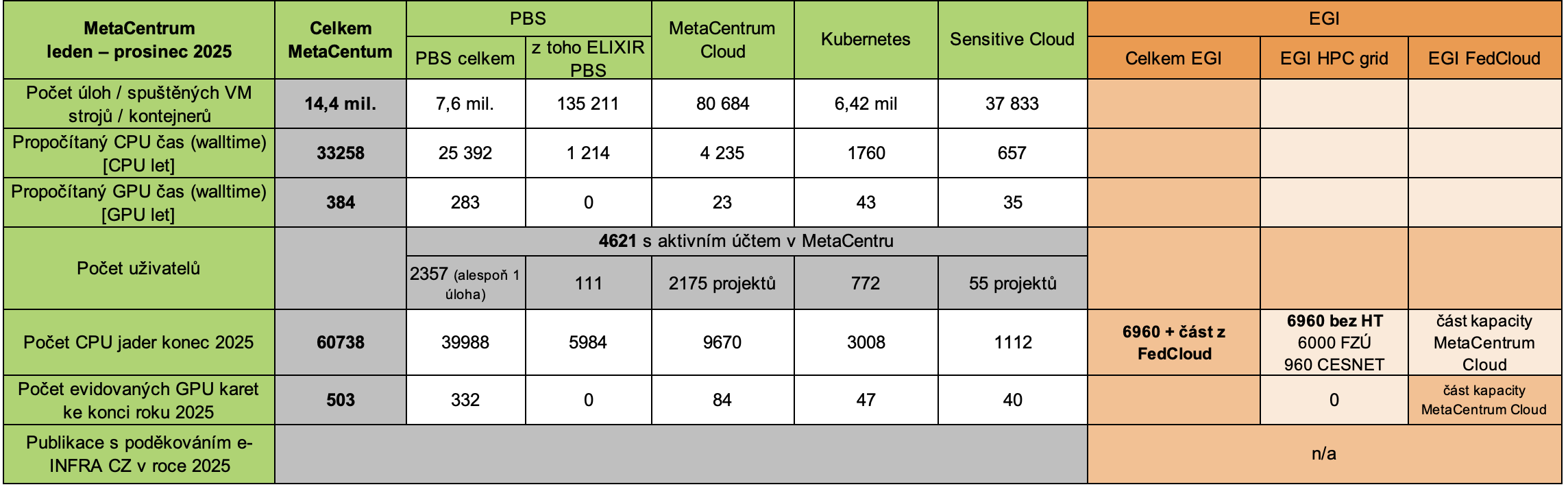 Celkový počet dostupných CPU jader v národním prostředí (včetně zapojení do mezinárodní sítě EGI) dosáhl 60 738 (pro srovnání 53 004 v roce 2024).