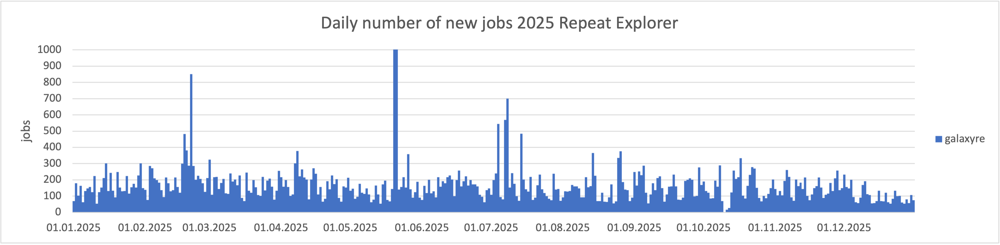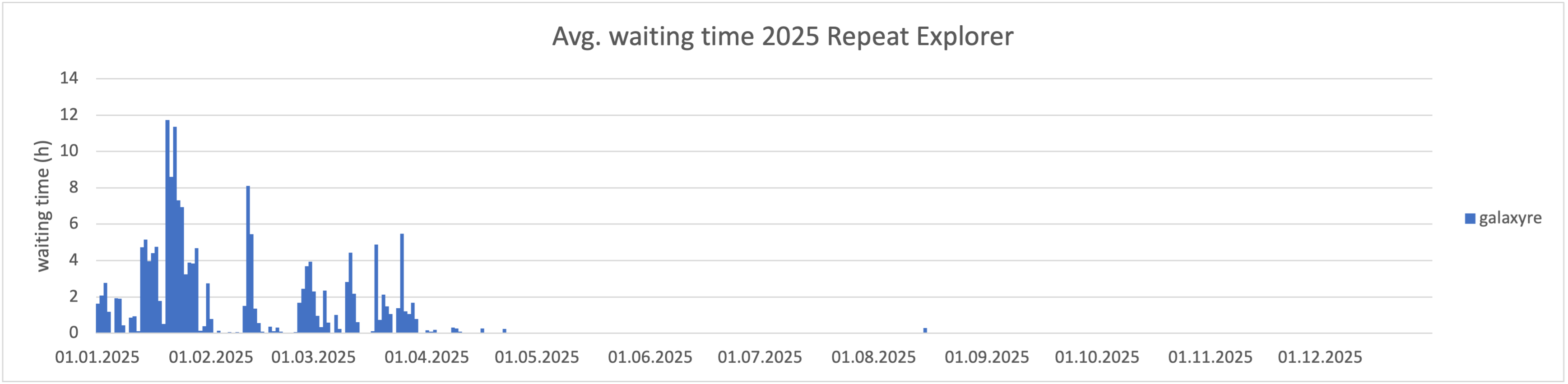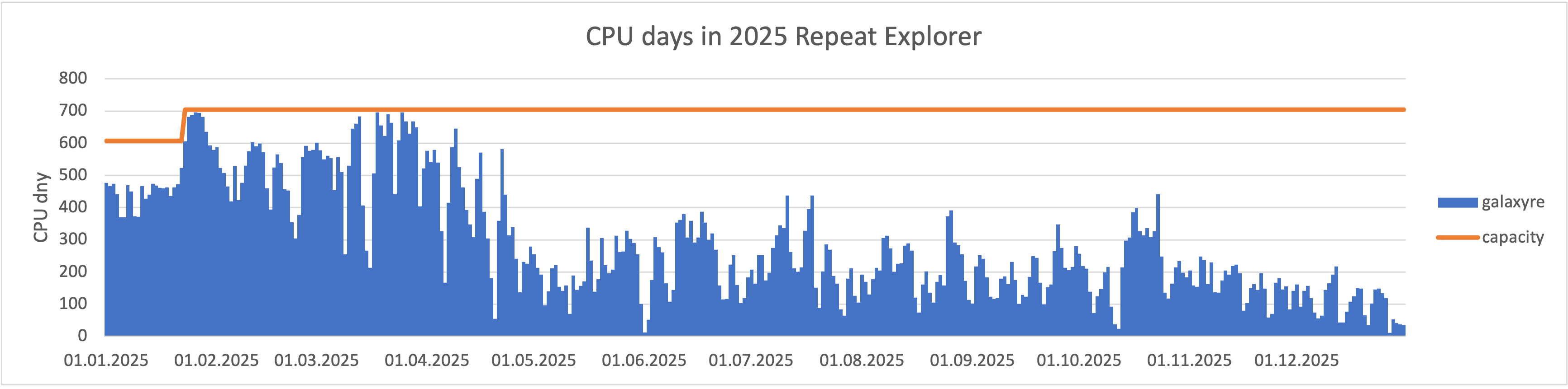 Službě RE Galaxy bylo vyhrazeno po většinu roku 700 CPU jader. V únoru jsme zaznamenali výrazné navýšení počtu příchozích úloh, a proto došlo k navýšení výpočetní kapacity ze 600 na 700 CPU jader.