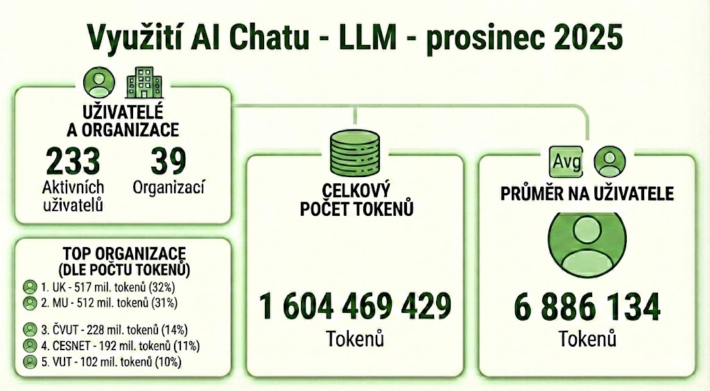Od spuštění služby se k AI chatu přihlásilo téměř 1000 uživatelů. Nicméně podrobnější statistiky využití jazykových modelů jsou sesbírané pouze za 1 měsíc. Podrobná anonymizovaná telemetrická data se sbírají od prosince 2025 až díky napojení na LightLLM. Data slouží k detailnější analýze využití a optimalizaci nastavení infrastruktury.
