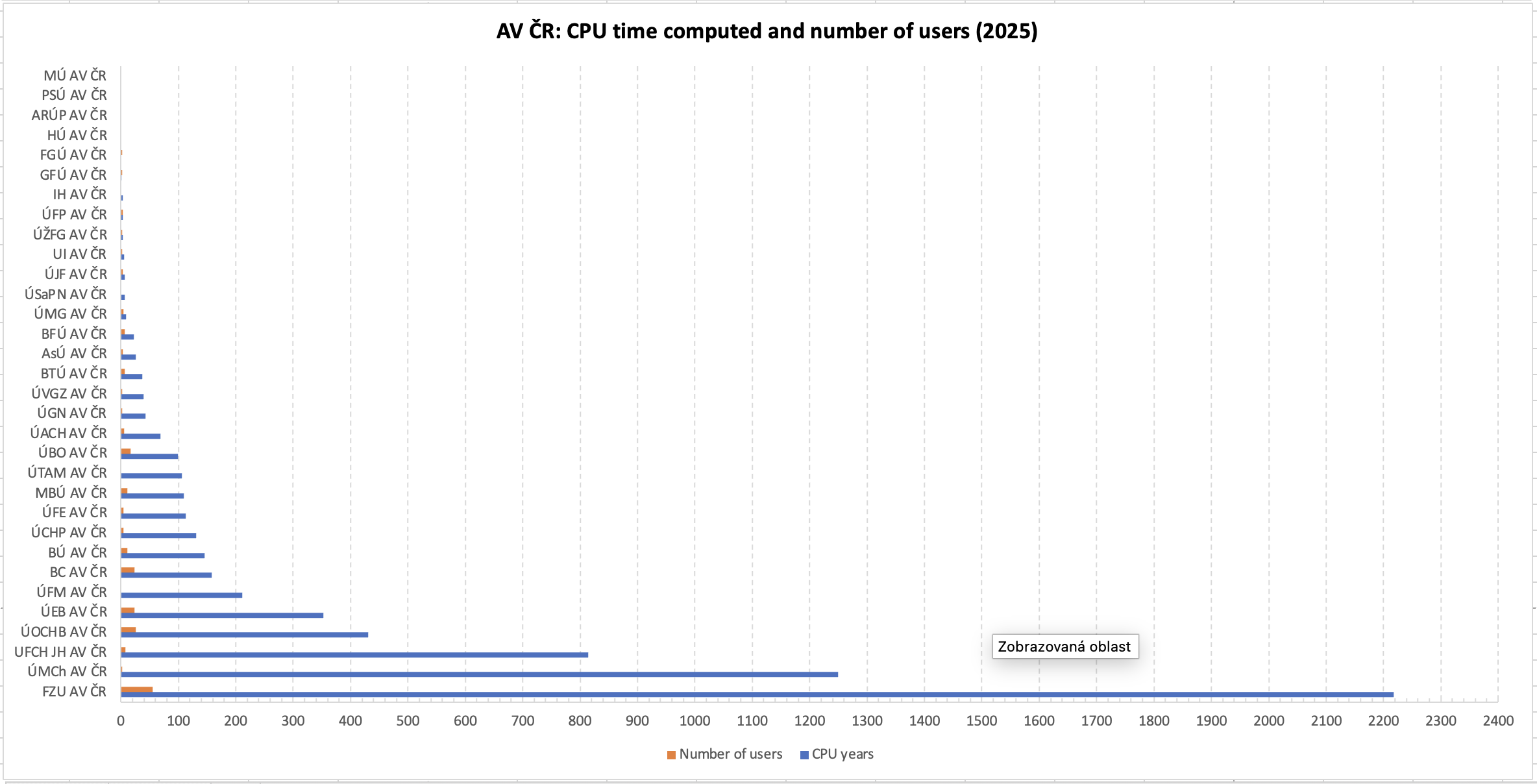 Využití MetaCentra organizacemi (PBS) dle propočítaného času. Na prvním grafu je Akademie věd započítána jako jedna organizace, na druhém pak jak počítaly jednotlivé ústavy v rámci Akademie věd. Do počtu uživatelů jsou započítáni pouze ti, kteří v roce 2025 spustili alespoň jednu úlohu.