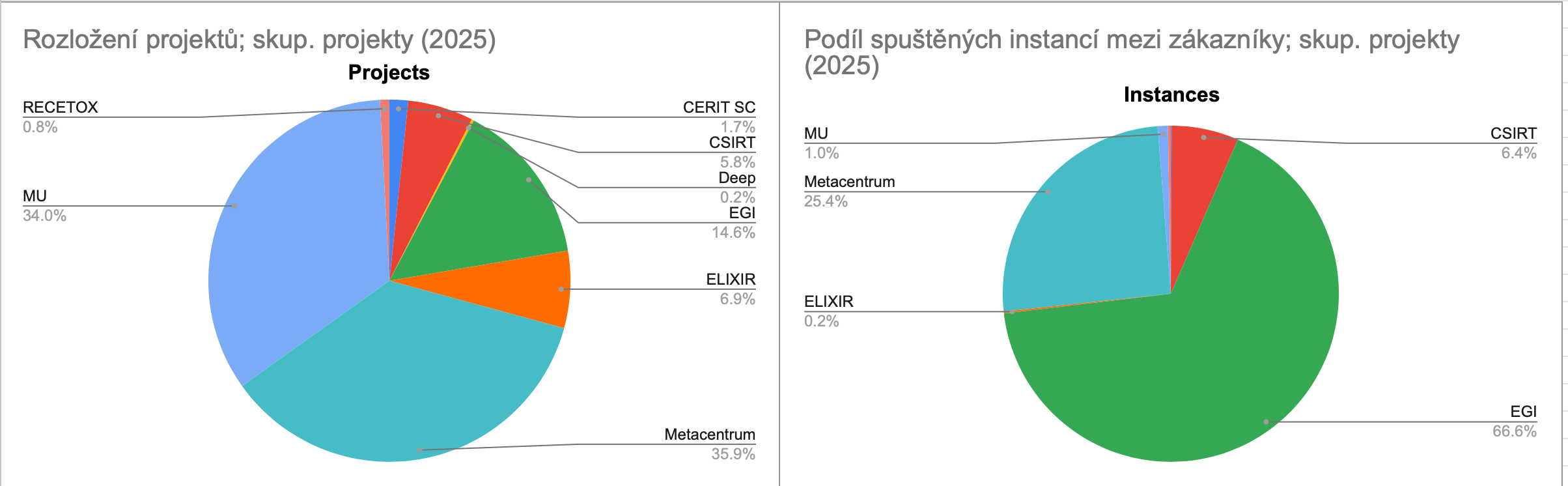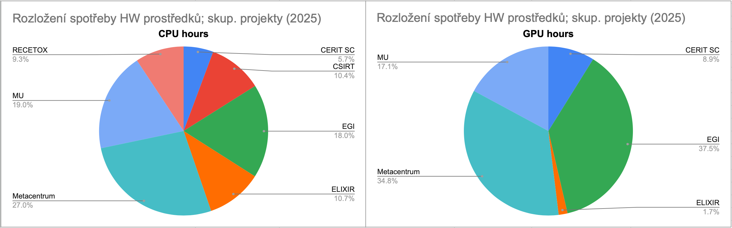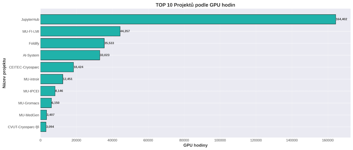 Výkon GPU karet je k dispozici pouze skupinovým projektům. GPU jádra nejvíce využívaly skupinové projekty zákazníka EGI (FedCloud), který v roce 2025 provozoval celkem 70 projektů, a Metacentrum se 172 projekty. Mezi deseti projekty s nejvyšší spotřebou GPU času dominují tyto dva subjekty.