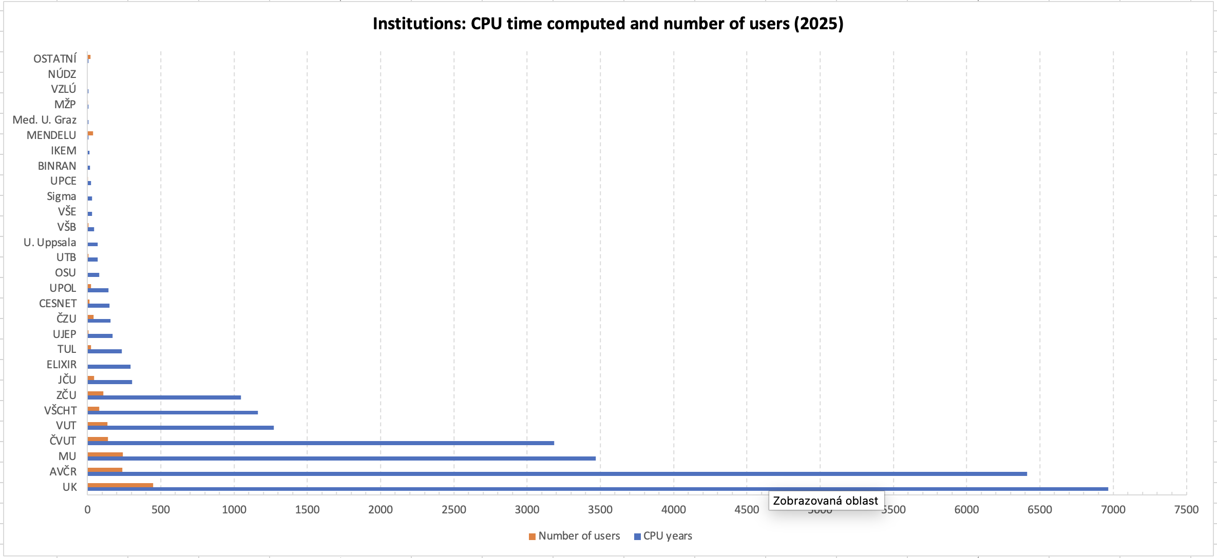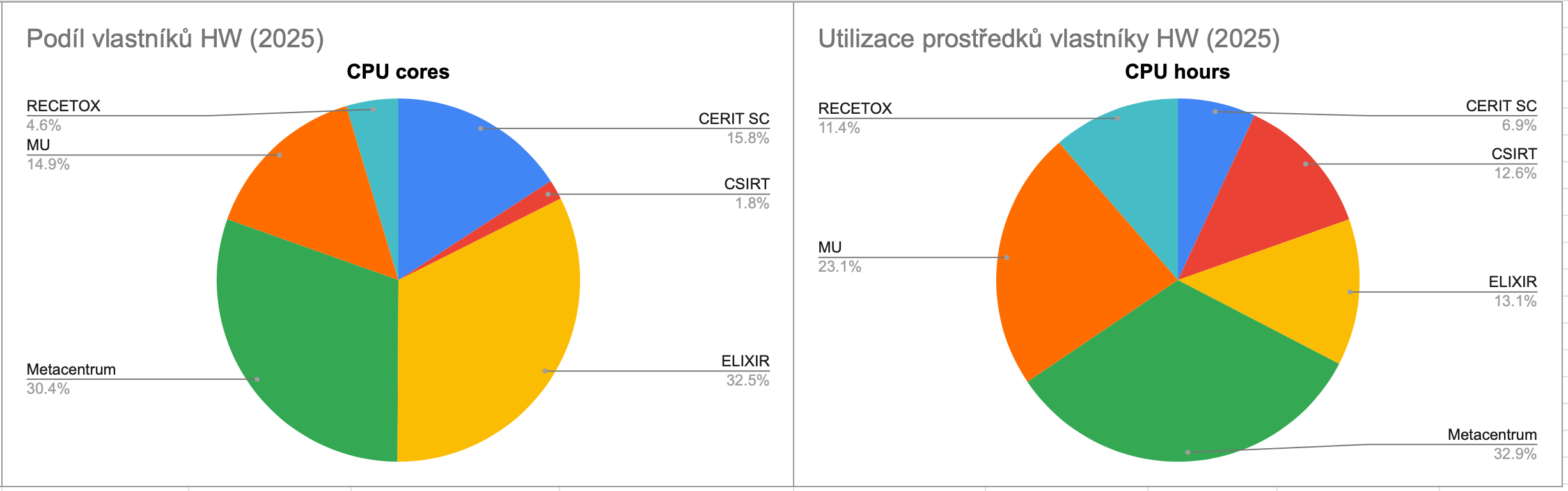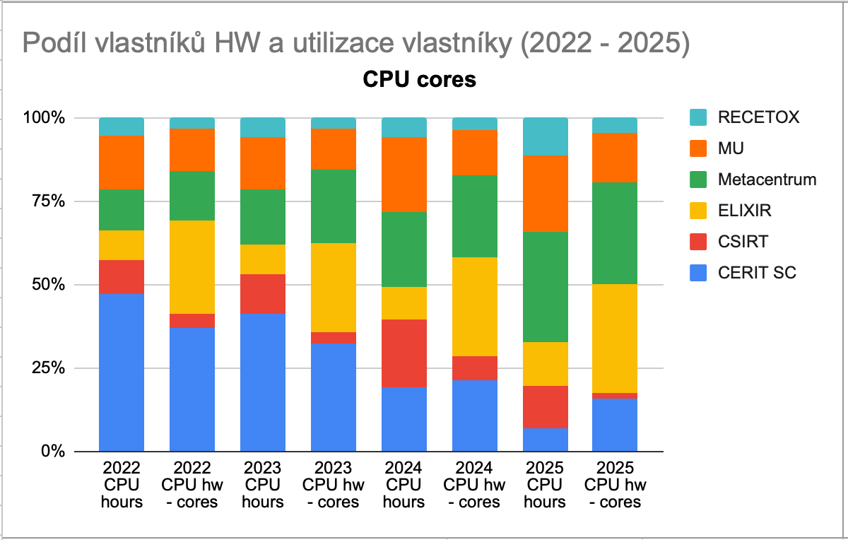 Srovnáním podílu na celkovém množství spotřebovaného času CPU jader (sloupec 2025 CPU hours) a vlastnickém podílu v celkovém objemu clusterů (sloupec 2025 CPU hw - cores) lze posoudit, zda zákazníci využívají CPU čas adekvátně vzhledem ke svému podílu investic do HW.