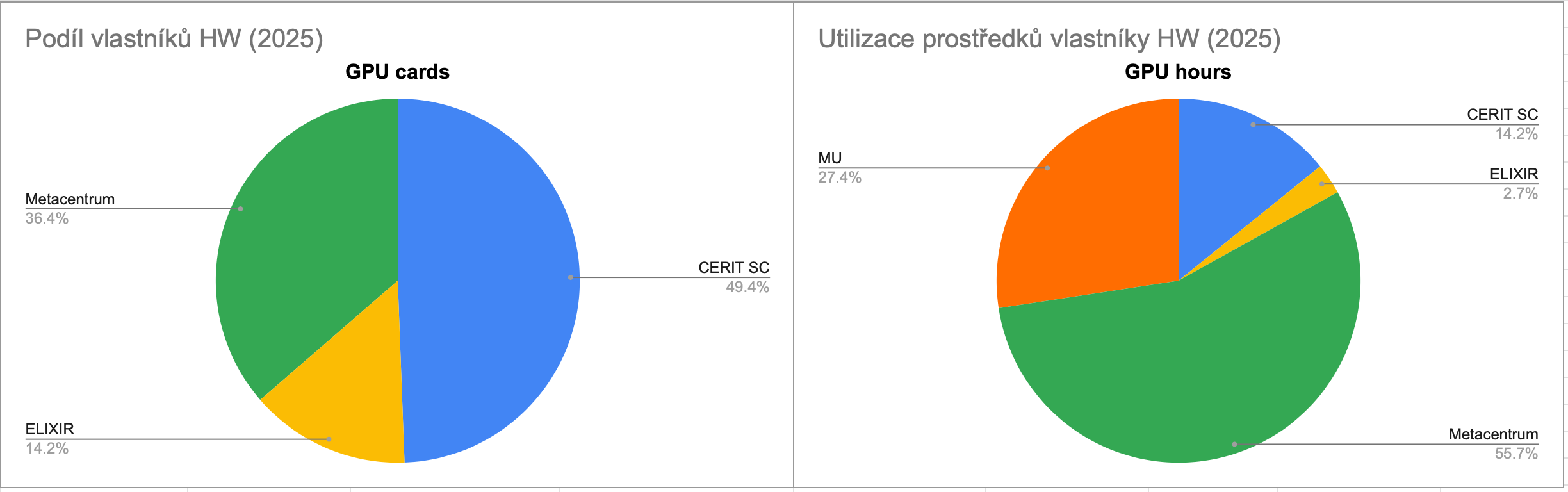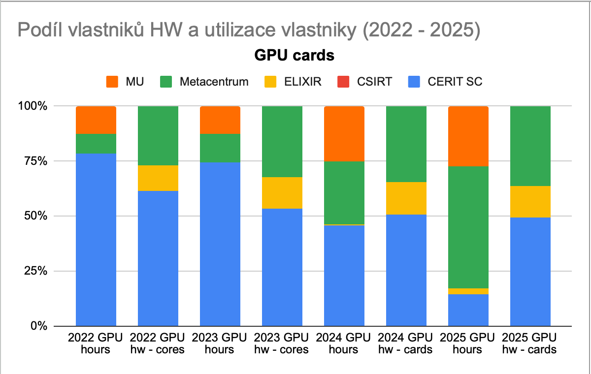 I v případě GPU kapacity cloudu evidujeme podíl vlastnictví jednotlivých organizací, které akcelerátory zakoupily.
