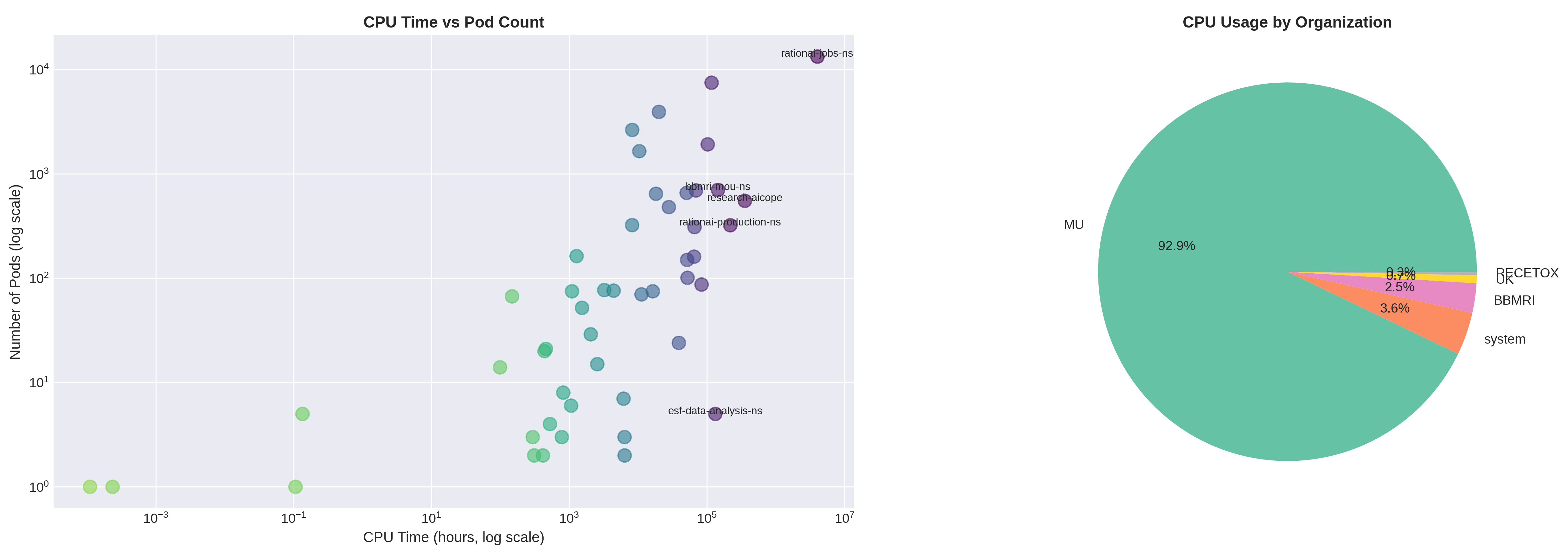 Levý graf ukazuje distribuci CPU času v jednotlivých podech. Z grafu je zřejmé, že projekt rationai má nejvíce podů s největším propočítaným časem. Pravý graf ilustruje podíl propočítaného času podle jednotlivých organizací.