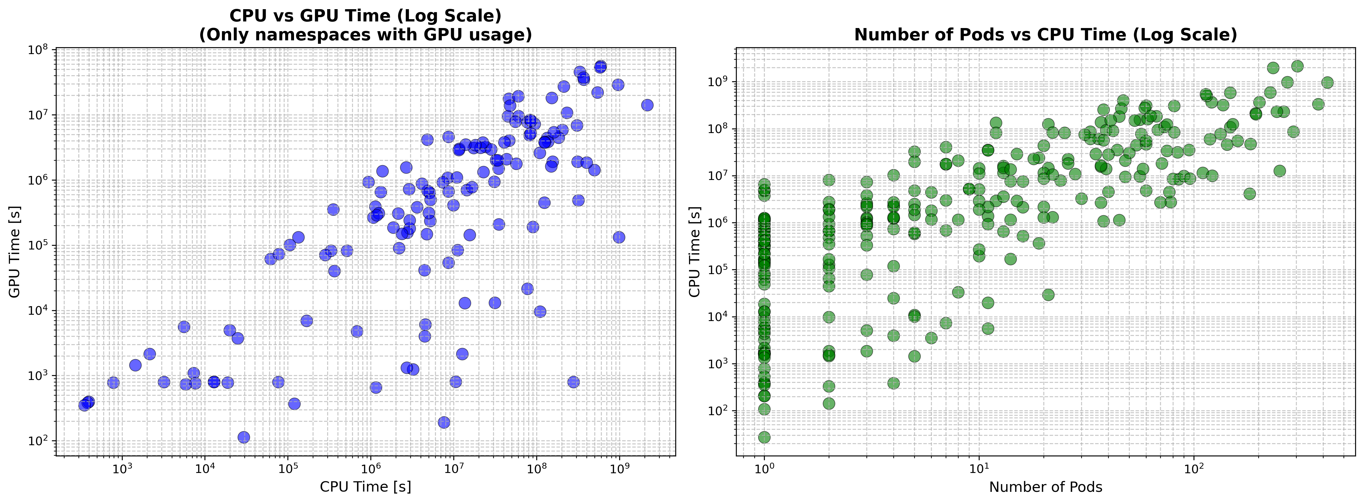 Na levém grafu CPU vs. GPU čas: Mezi těmito metrikami existuje středně pozitivní korelace (0,47). Analýza zahrnuje 140 namespaců, které aktivně využívaly GPU. Započítány jsou pouze ty, které požadovaly i GPU.