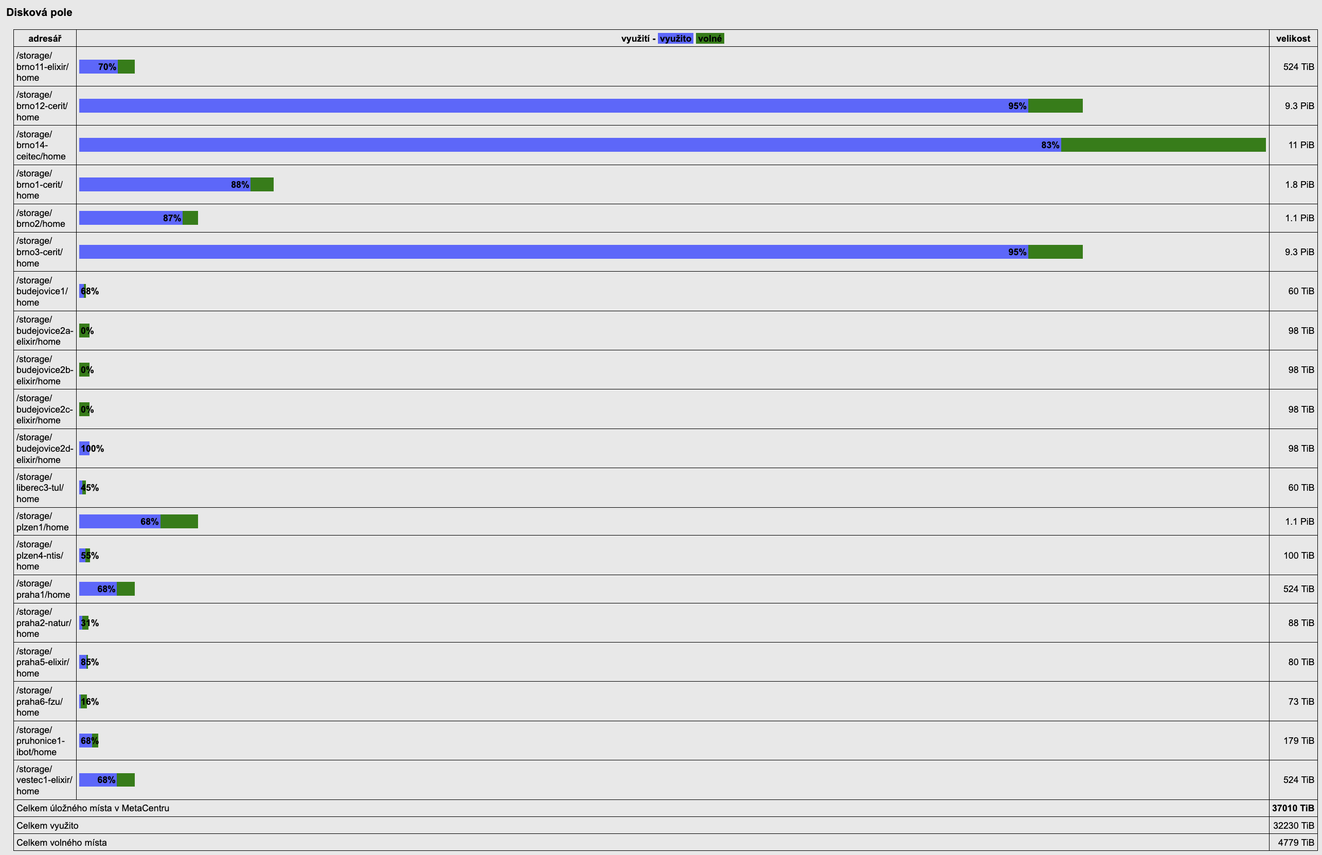 Meziročně opět vzrostlo zaplnění diskových polí v MetaCentru i v CERIT-SC. Mimo to se podařilo integrovat disková pole jiných vlastníků do infrastruktury MetaCentra (CEITEC, ELIXIR, FZÚ, TUL). Přístup na taková pole je dedikován vlastníkům, po dohodě s nimi může být přístupný i pro další uživatele.