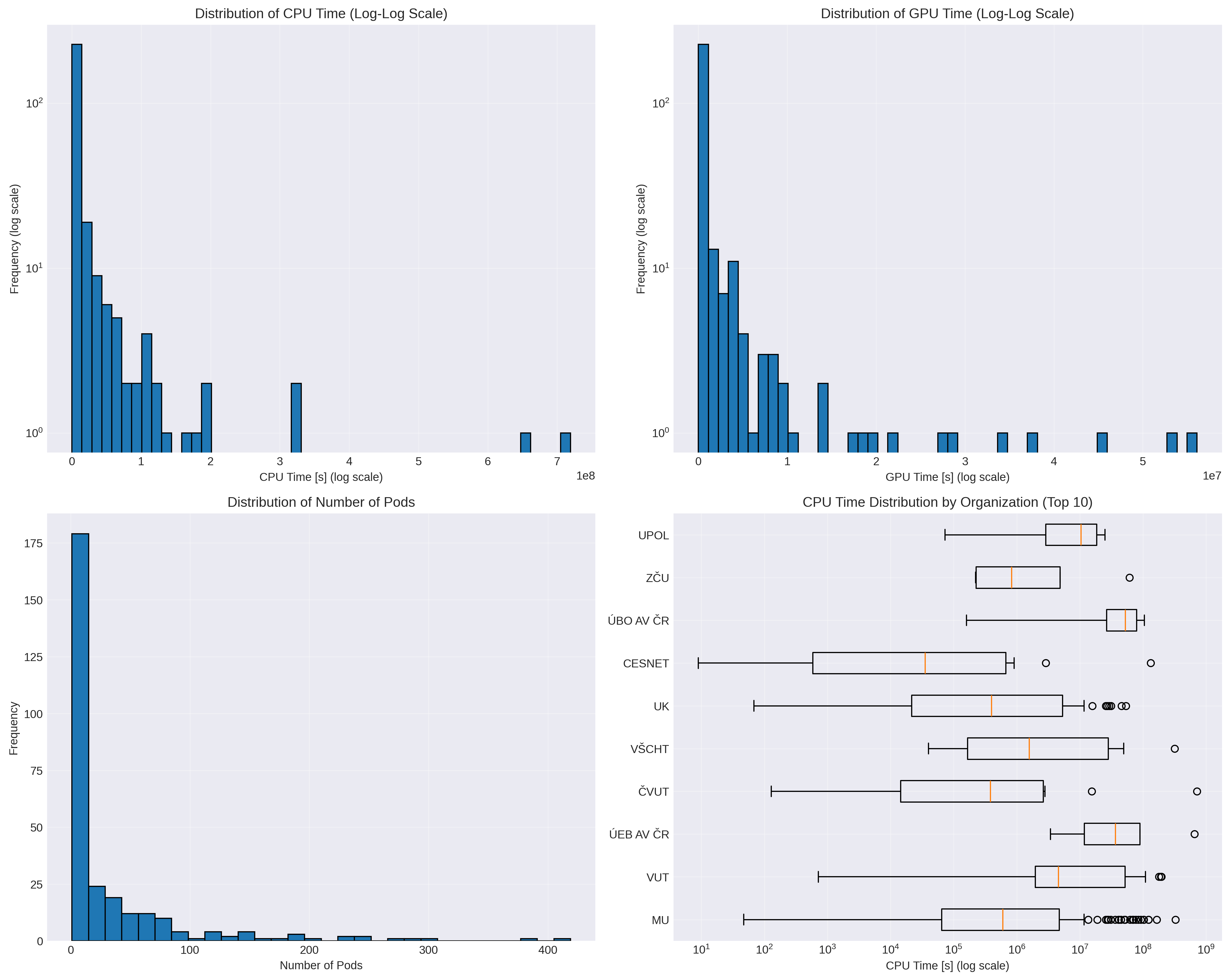 Distribuce CPU a GPU času, podů a organizací v Jupyter Noteboocích.