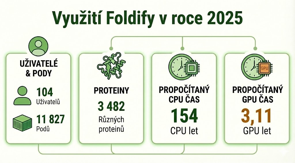 Webovou grafickou službu Foldify, která sdružuje nástroje jako Alphafold, ColabFold, Omegafold, ESMFold využilo 104 uživatelů, kteří s její pomocí spočítali 3 482 různých proteinů a propočítali tím 154 CPU let a 3,11 GPU let.