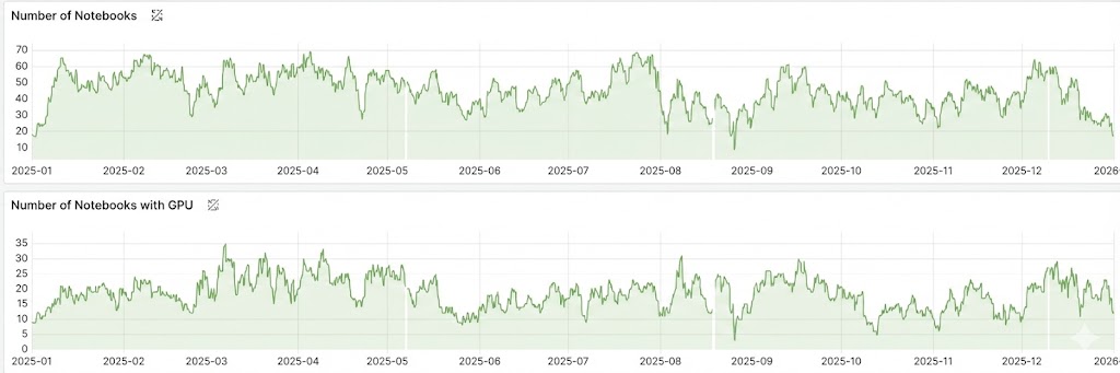 Počet běžících Jupyter Notebooků v jednotlivých dnech roku 2025.
