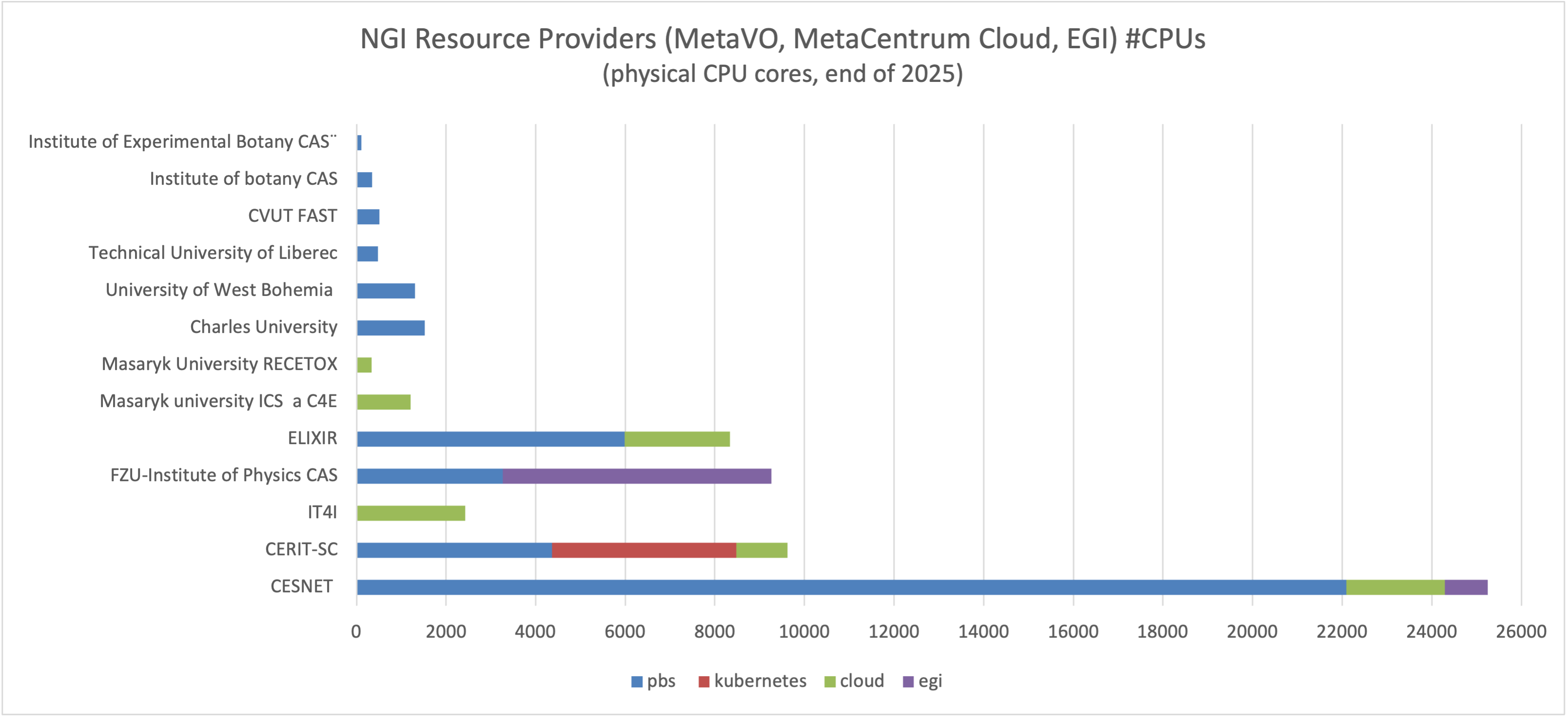 Na konci roku 2025 bylo v MetaCentru k dispozici celkem 60 738 CPU jader v následujícím členění dle vlastníků a služeb: