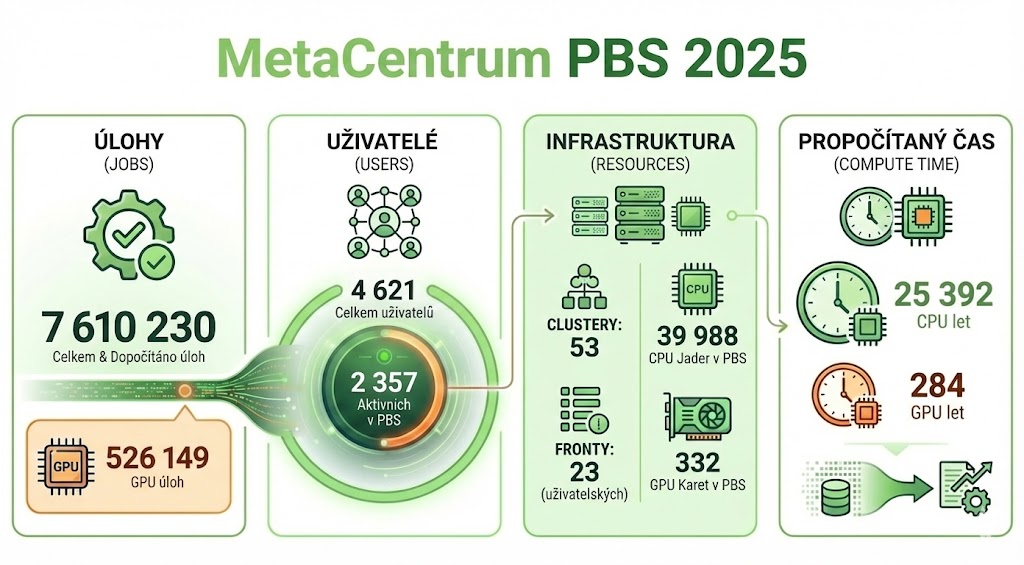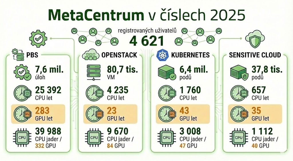 Na konci roku 2025 mělo MetaCentrum 4 621 aktivních uživatelů. Ve srovnání s koncem roku 2023 (3 490 účtů) jde o nárůst o 32 %. Tento trend potvrzuje, že zájem o akademické výpočetní zdroje v ČR neustále stoupá.