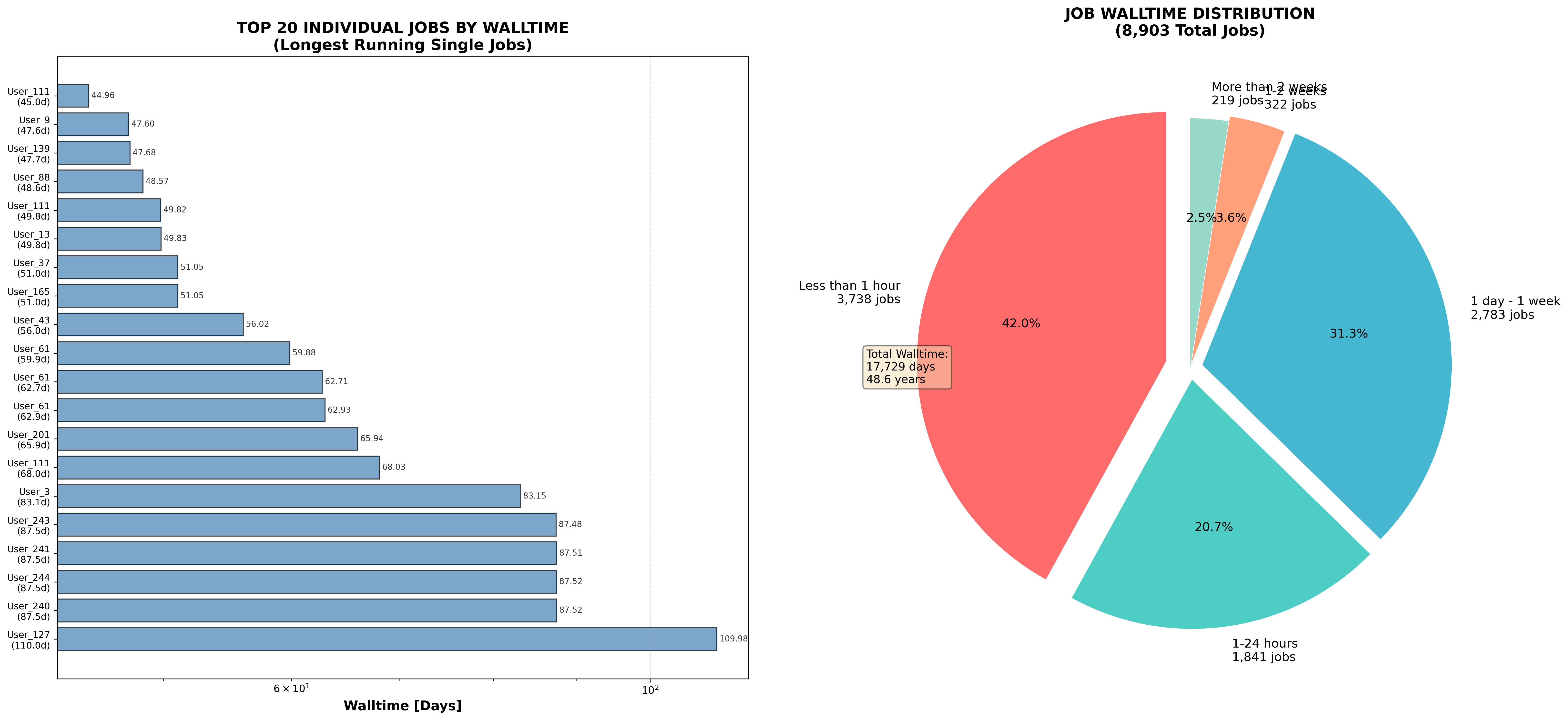 Nejdelší aktivní notebook běžel 110 dní. Na levém grafu je TOP 20 uživatelů podle délky běhu notebooku. Pravý graf ukazuje podíl úloh podle délky běhu notebooku: