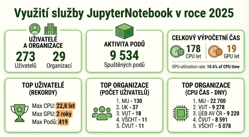 Webovou službu JupyterHub s JupyterNotebooky využilo 273 uživatelů z 29 organizací. Data pocházejí pouze z ukončených podů k poslednímu dni v roce. Uživatelé propočítali 178 CPU let a 19 GPU let ve 9 534 podech.