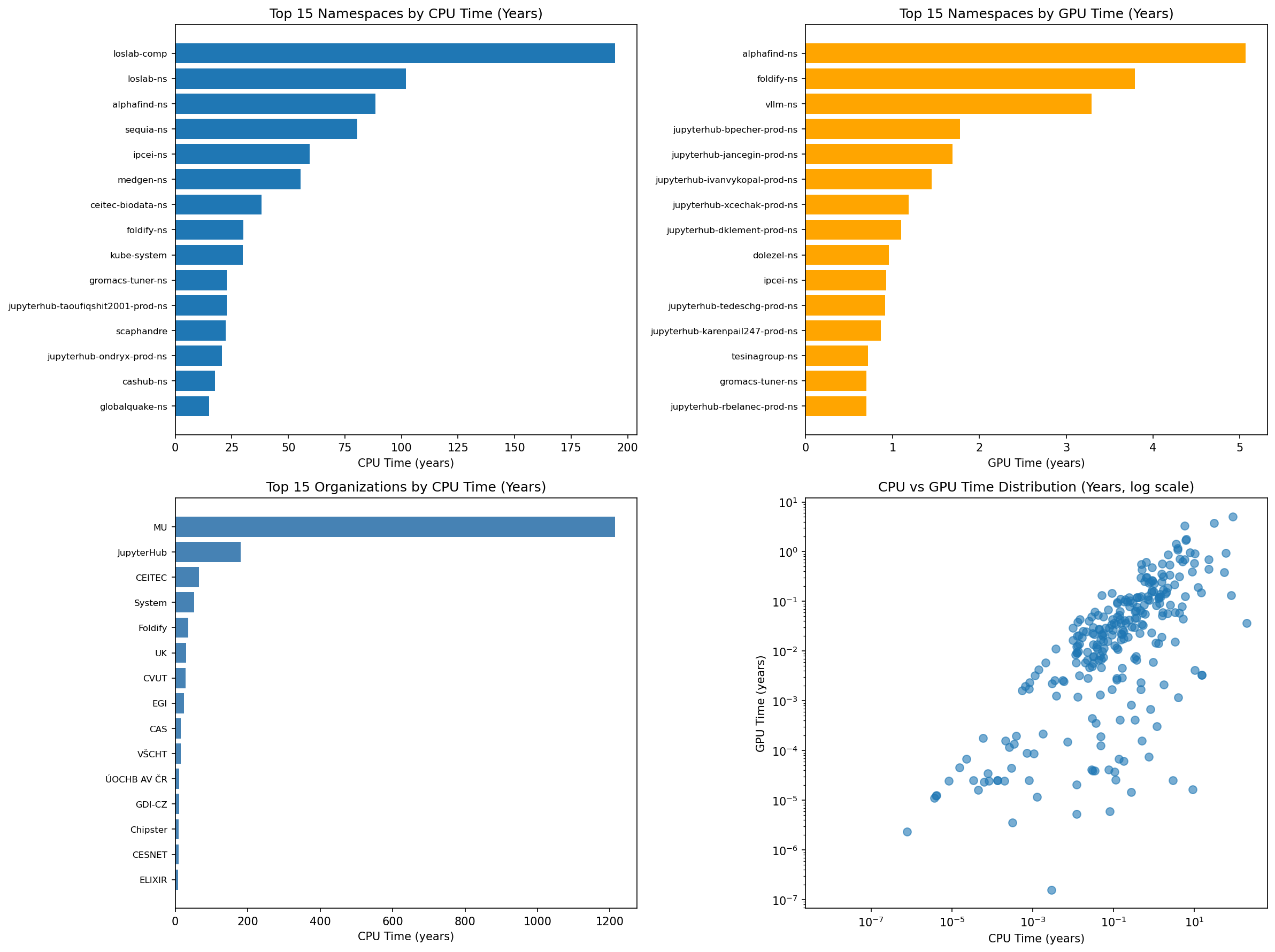106 projektů v roce 2025 propočítalo 81% celkového CPU času v Kubernetes, tj. 1 419 CPU let a 92% celkového GPU času, tj. 39,4 GPU let. Zbytek připadl na osobní účty.