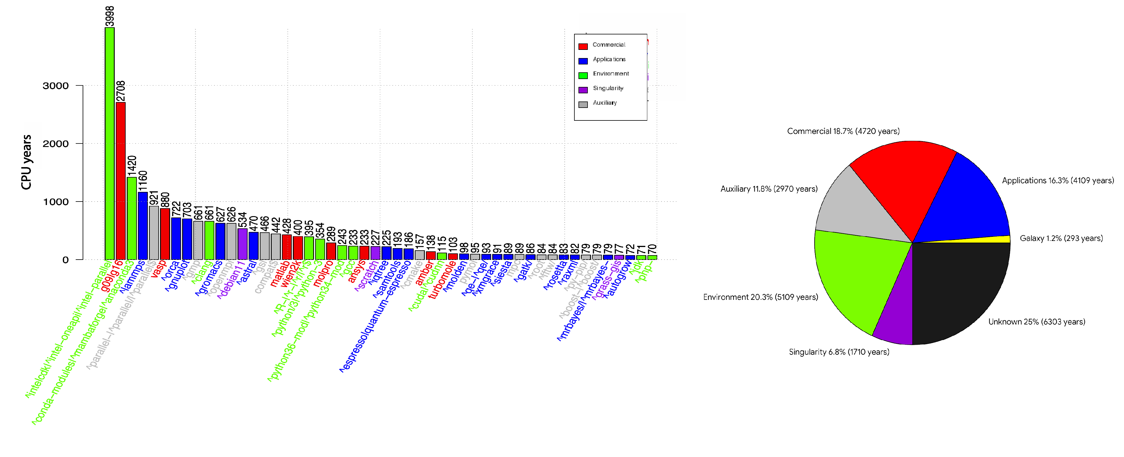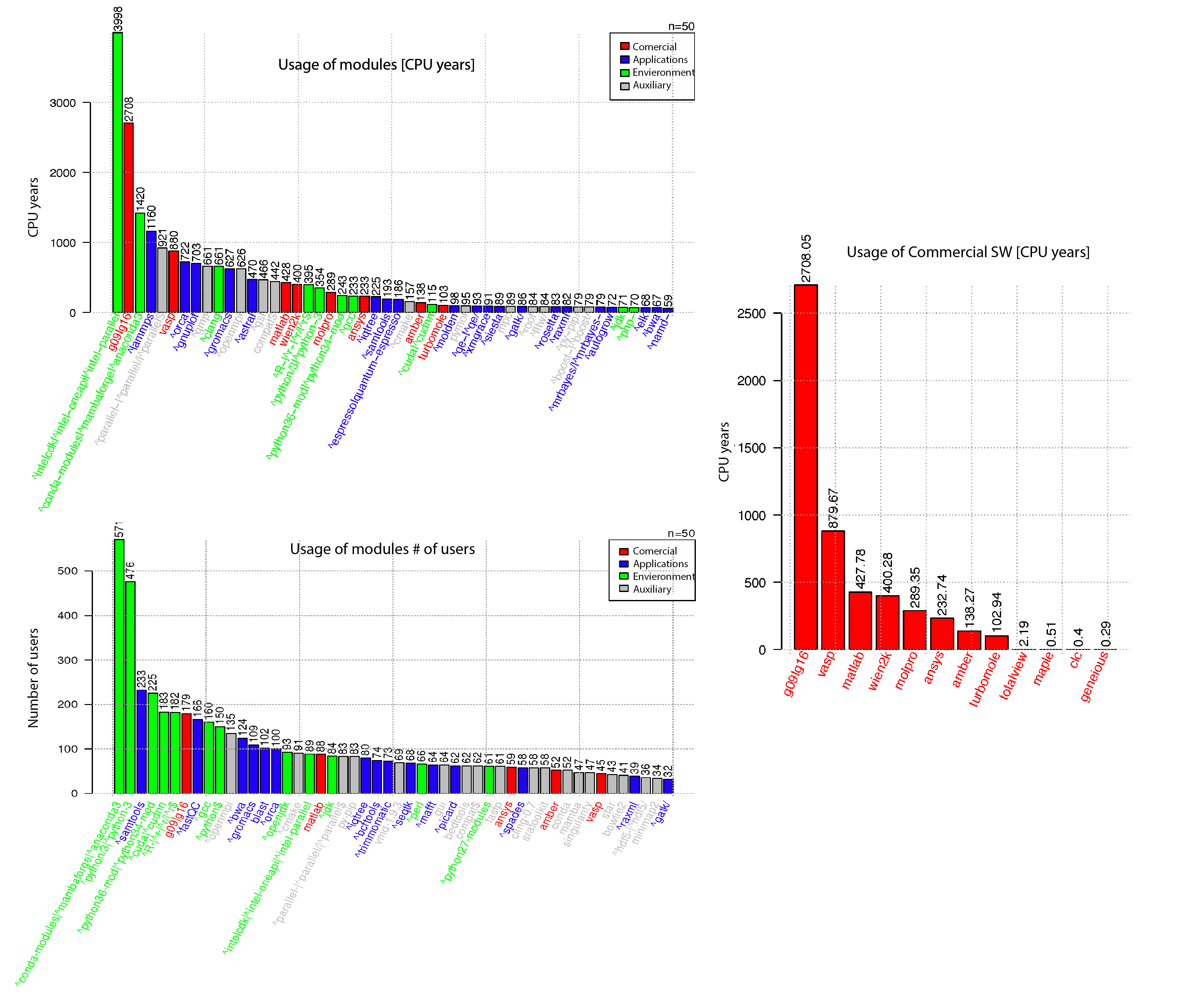 V roce 2025 uživatelé na výpočetním clusteru využili přibližně 4 000 různých softwarových modulů ve více než 4 milionech úloh. Analýza ukázala, že 50 nejčastěji používaných modulů spotřebovalo 91 % celkového CPU času všech úloh. Celkový CPU čas komerčních softwarů tvořil 22 % z celkového propočítaného výpočetního času.