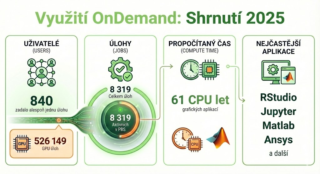 OpenOnDemand je grafické webové rozhraní pro spouštění interaktivních úloh, umožňující grafický náhled a manipulaci (Matlab, Ansys, Jupyter, apod.) a zároveň je zde možné jednoduše spouštět i dávkové úlohy. V obou případech úlohy běžely v PBS a jsou započítané v souhrnné statistice dávkového prostředí.