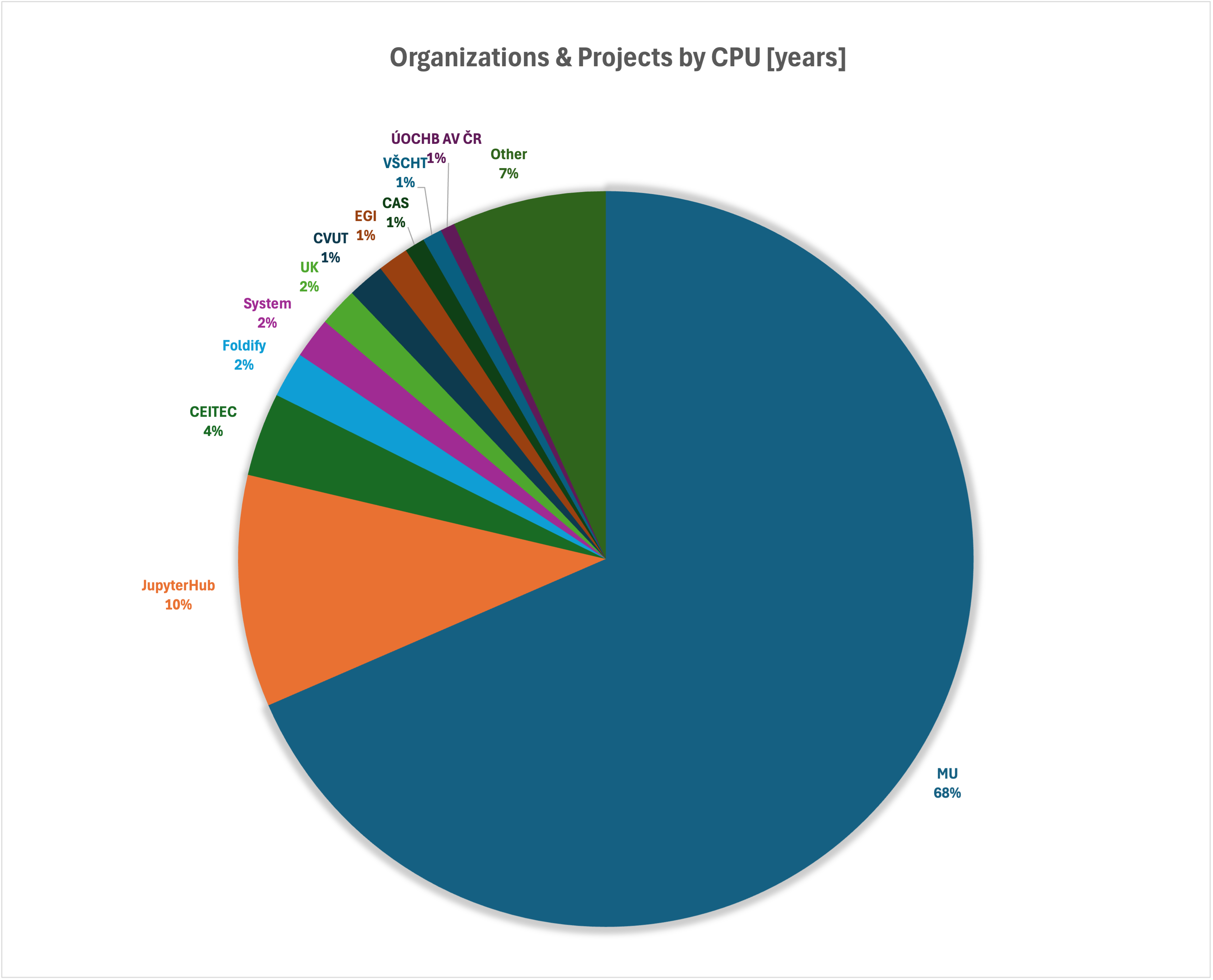 Nejaktivnější jsou uživatelé hlásící se k Masarykově univerzitě. Ta propočítala 610 CPU let, 93% celkového propočítaného času a 33 GPU let, 96% celkového propočítaného času. Projekty hlásící se k RECETOX a případně BBMRI spadají též pod MU, takže procento využití CPU a GPU času organizací MU by bylo, po započítání těchto dvou velkých projektů, ještě vyšší.