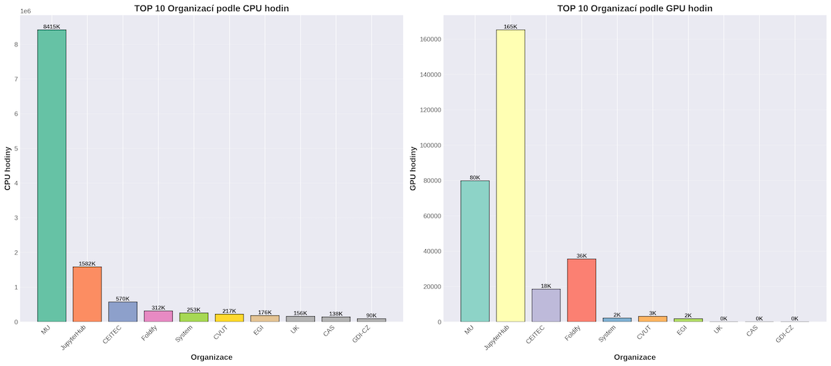 TOP 10 organizací s projektem v Kubernetes podle propočítaného CPU a GPU času.