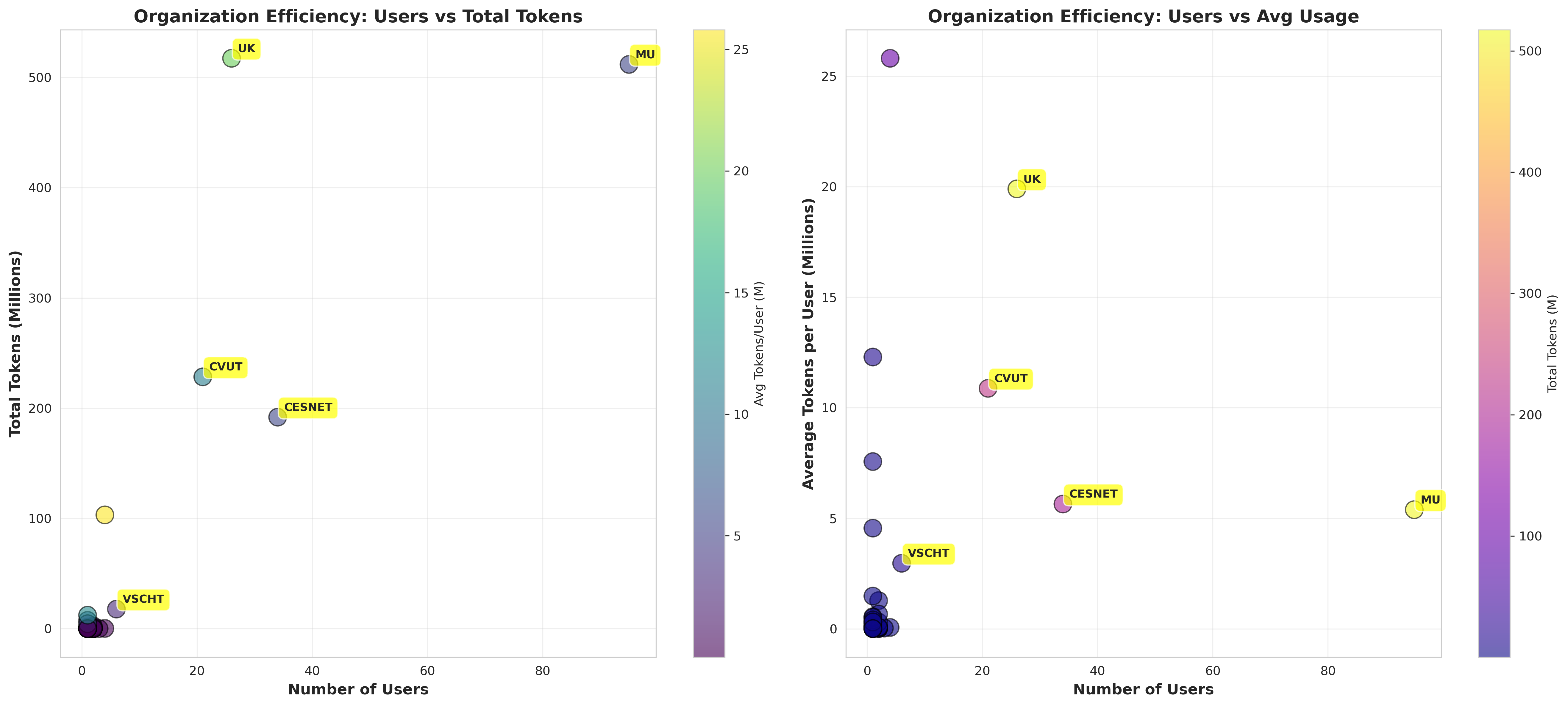 Rozptylové grafy (scatter plots) hodnotí efektivitu využití. Celkový počet tokenů zobrazuje vztah mezi počtem uživatelů organizace a spotřebou tokenů. Druhý graf ukazuje průměrný počet tokenů spotřebovaný v rámci organizace.