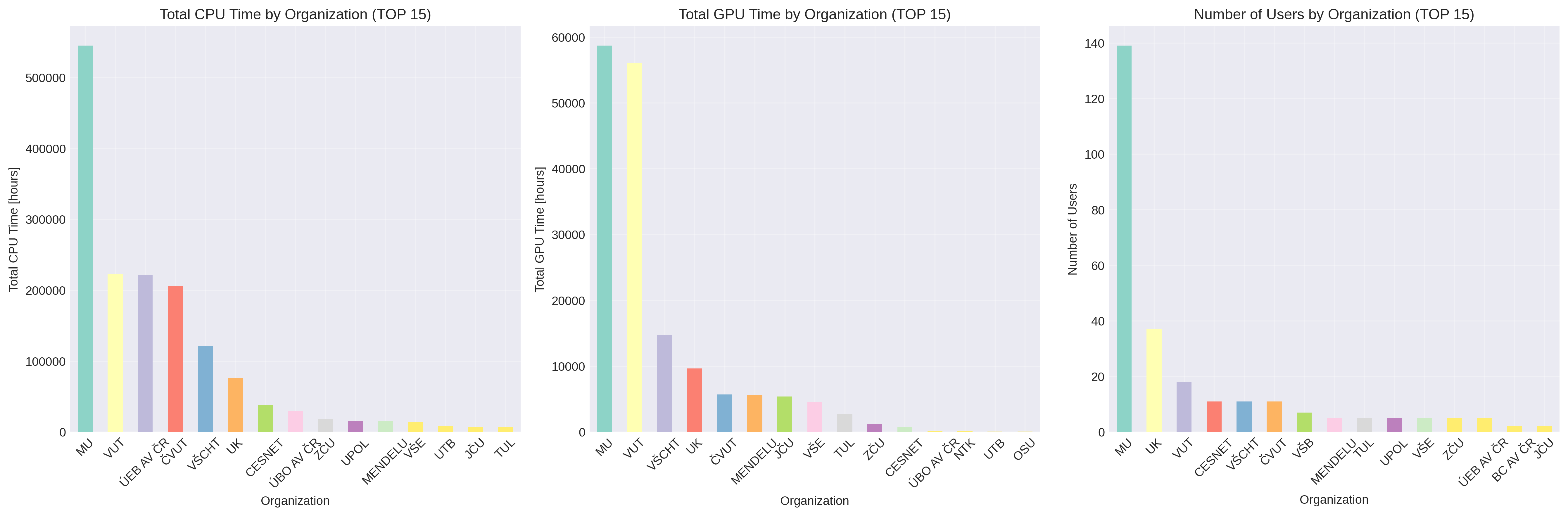 Jupyter: TOP 15 organizací podle počtu propočítaného CPU a GPU času a počtu uživatelů z dané organizace: