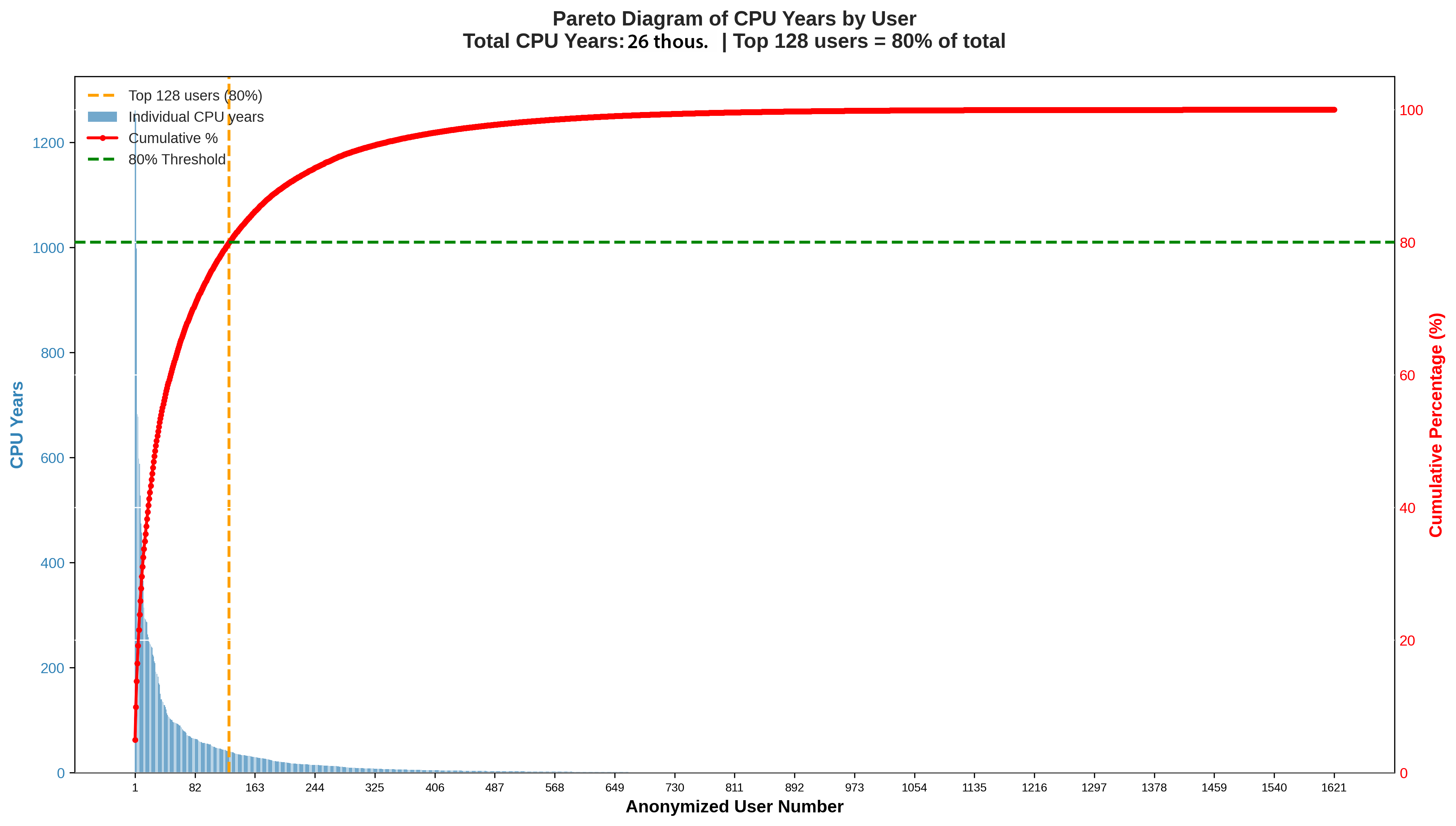 Paretův diagram ověřuje hypotézu 80/20. V grafu je kumulativní součet CPU časů propočítaných jednotlivými uživateli. Tito jsou seřazeni od největšího počtáře k nejmenšímu. Z analýzy vyplývá, že pouhých 128 uživatelů (7,9 % z 1 621) je zodpovědných za 80 % celkového výpočetního času. Zbytek (více než 92 % uživatelů) si dělí zbývajících 20 % kapacity. Průměr na jednoho uživatele činí 15,66 CPU let.