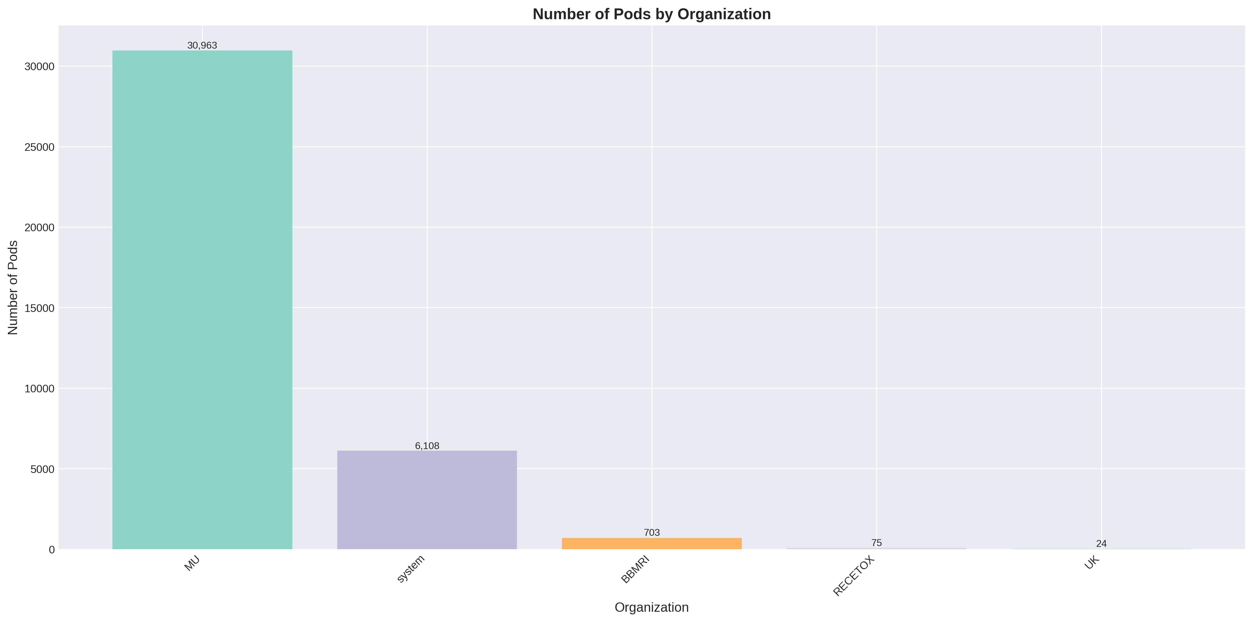 Počet podů spuštěných projekty z jednotlivých organizací. Opět vede Masarykova univerzita s 30 963 pody, což představuje 82% ze všech spuštěných podů.