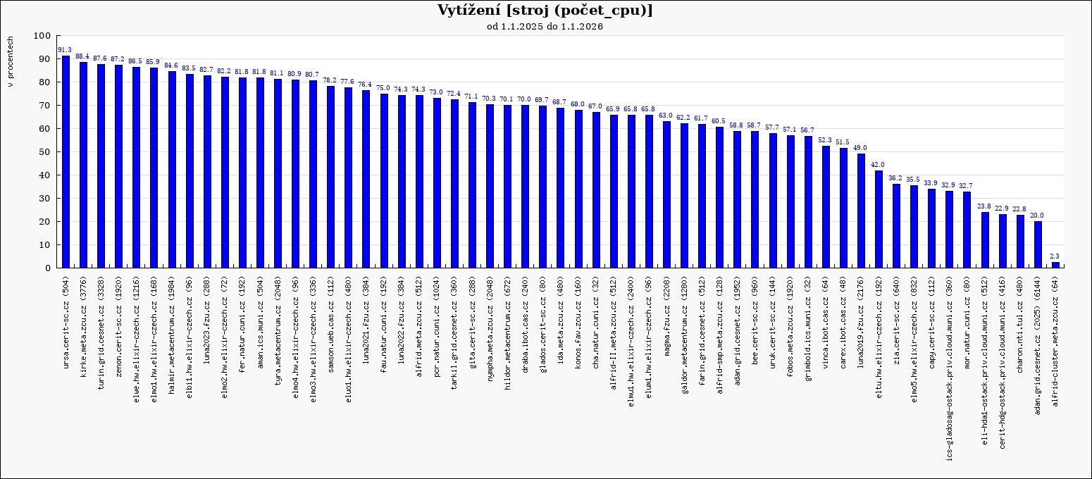 Následující graf ukazuje průměrné vytížení výpočetních clusterů a strojů v MetaVO v roce 2025. Základem pro výpočet průměrného vytížení (100%) je celkový počet dostupných CPU-core-seconds mínus počet CPU-core-seconds strojů, které nebyly v provozu. Rezervované stroje jsou započítané tak, jako by byly plně využity, bez ohledu na jejich skutečné využití. Údaj v závorce udává počet CPU v clusteru na konci roku. Nula značí, že cluster byl v průběhu roku vyřazen.