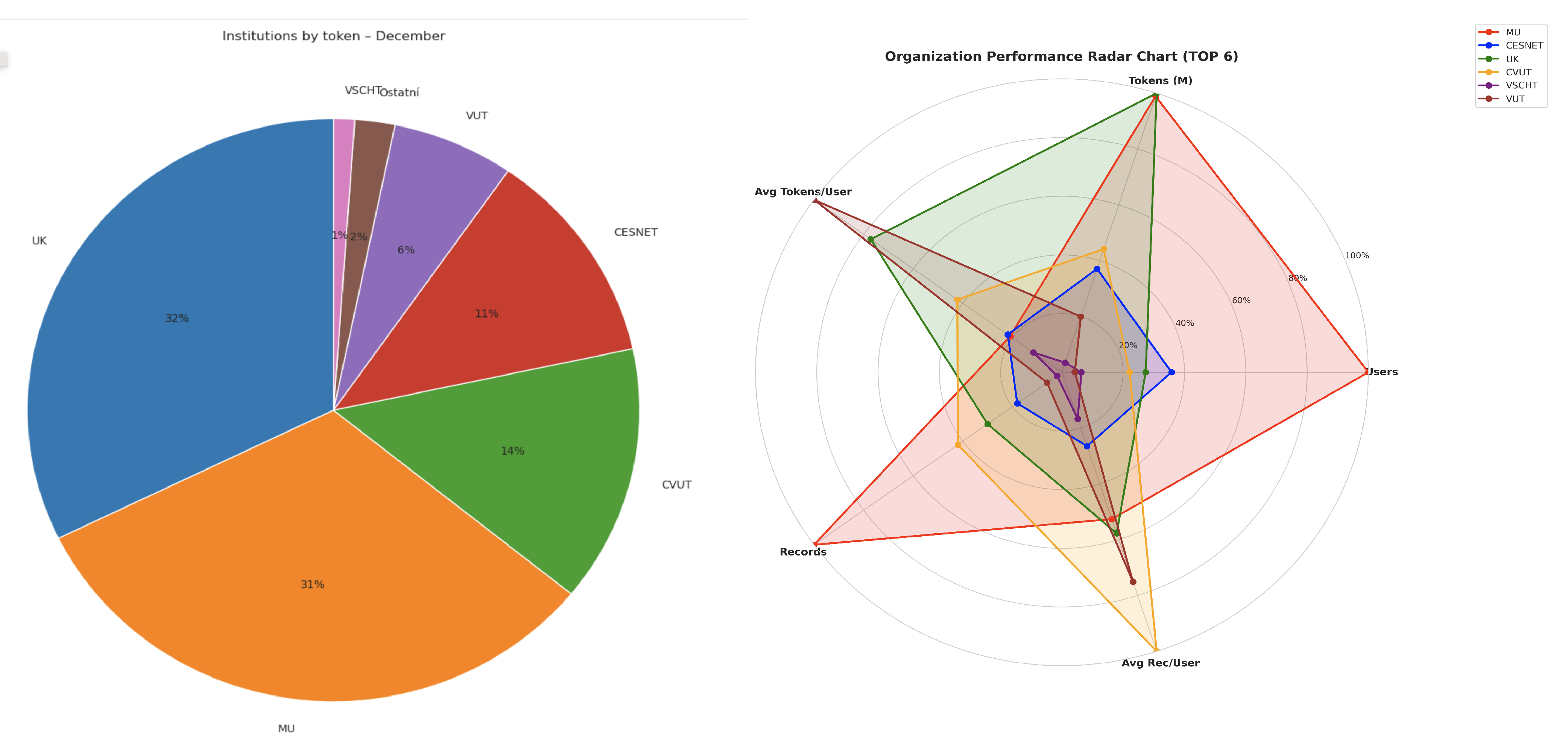 Využití počtu tokenů institucemi v podílovém grafu. Tři nejaktivnější organizace využívají více než 3/4 všech spotřebovaných tokenů. Pravý graf ukazuje spider/radar graf pro TOP 6 organizací. Každá organizace má svoji barvu a hodnoty na pěti osách tvoří uzavřený pavoukový útvar. Čím větší plocha a rozložení úseček, tím vyšší spotřeba v dané dimenzi. Sleduje se počet uživatelů, počet tokenů, průměrný počet tokenů na uživatele organizace, počet dotazů a jejich průměr na uživatele organizace.