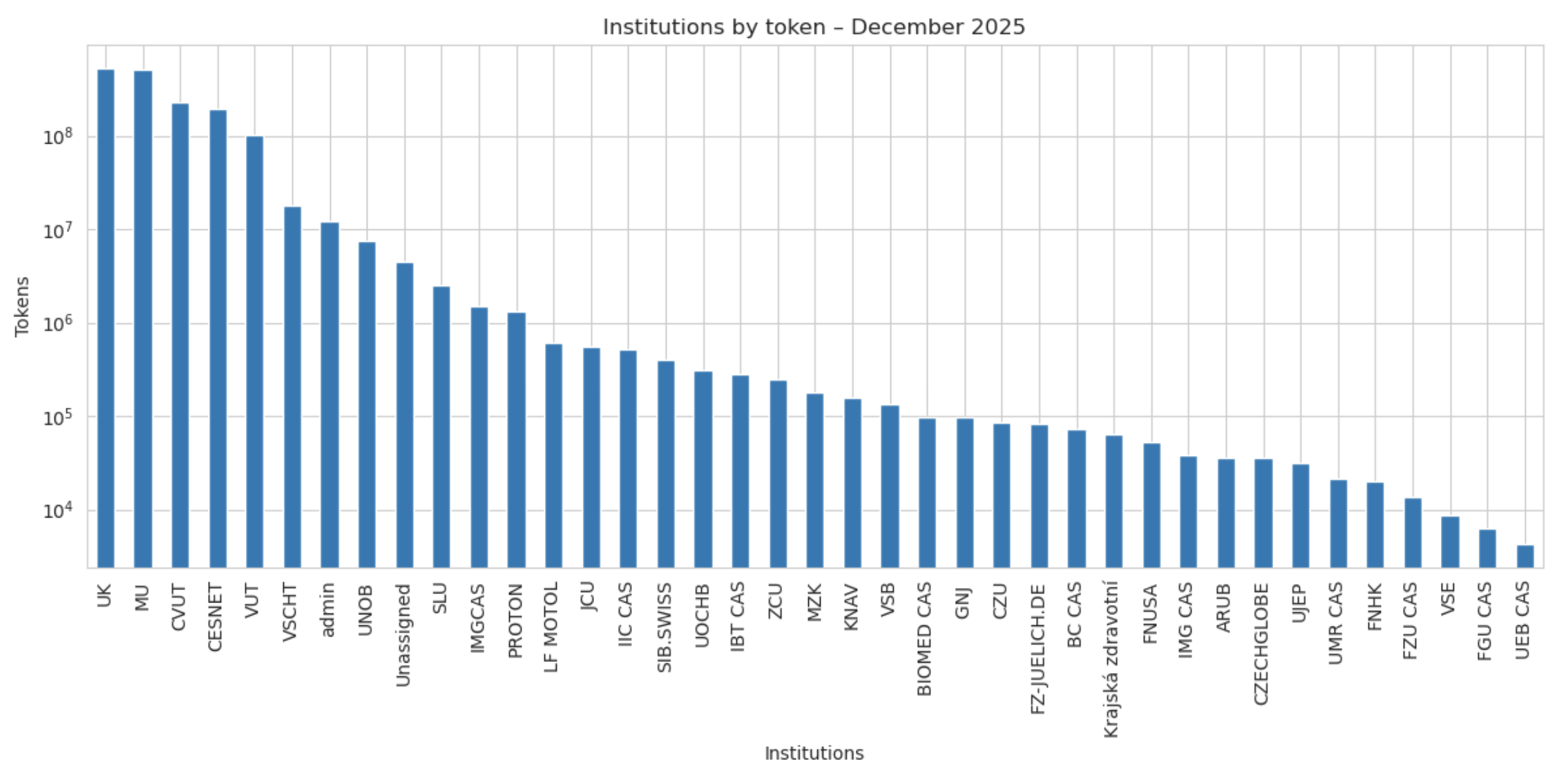 Jazykové modely v prosinci využívalo 233 uživatelů z 39 institucí. Nejaktivnější byli uživatelé z Karlovy univerzity s 517 mil. tokenů (32%), následovala Masarykova univerzita s 512 mil. tokenů (31%), ČVUT 228 mil. tokenů (14%), CESNET 192 mil. tokenů (11%) a VUT 102 mil. tokenů (10%)