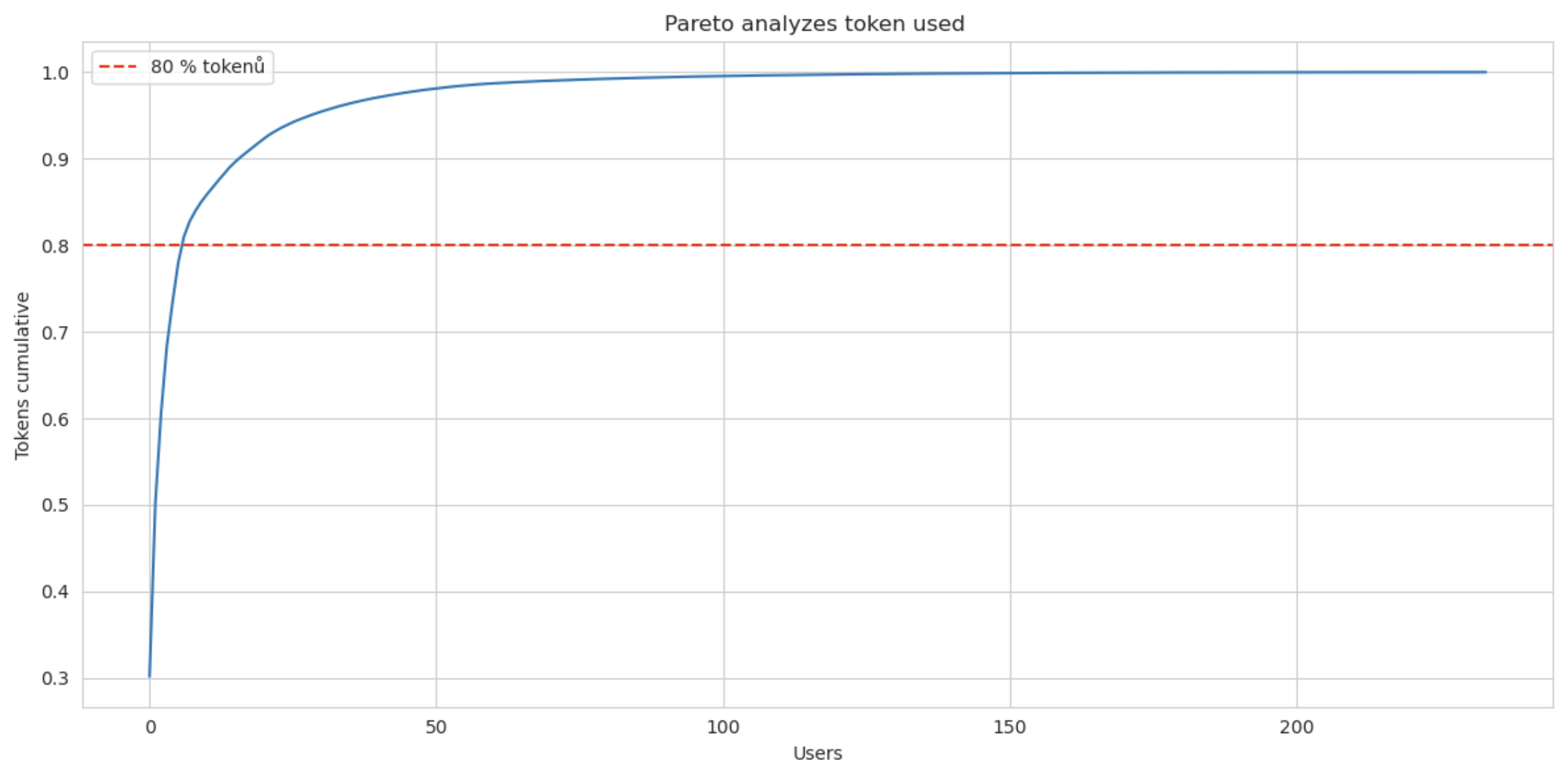 Pareto analýza. TOP 6 uživatelů spotřebovalo 80 % tokenů. Celkově uživatelé během jediného měsíce spotřebovali 1,6 mld. tokenů.