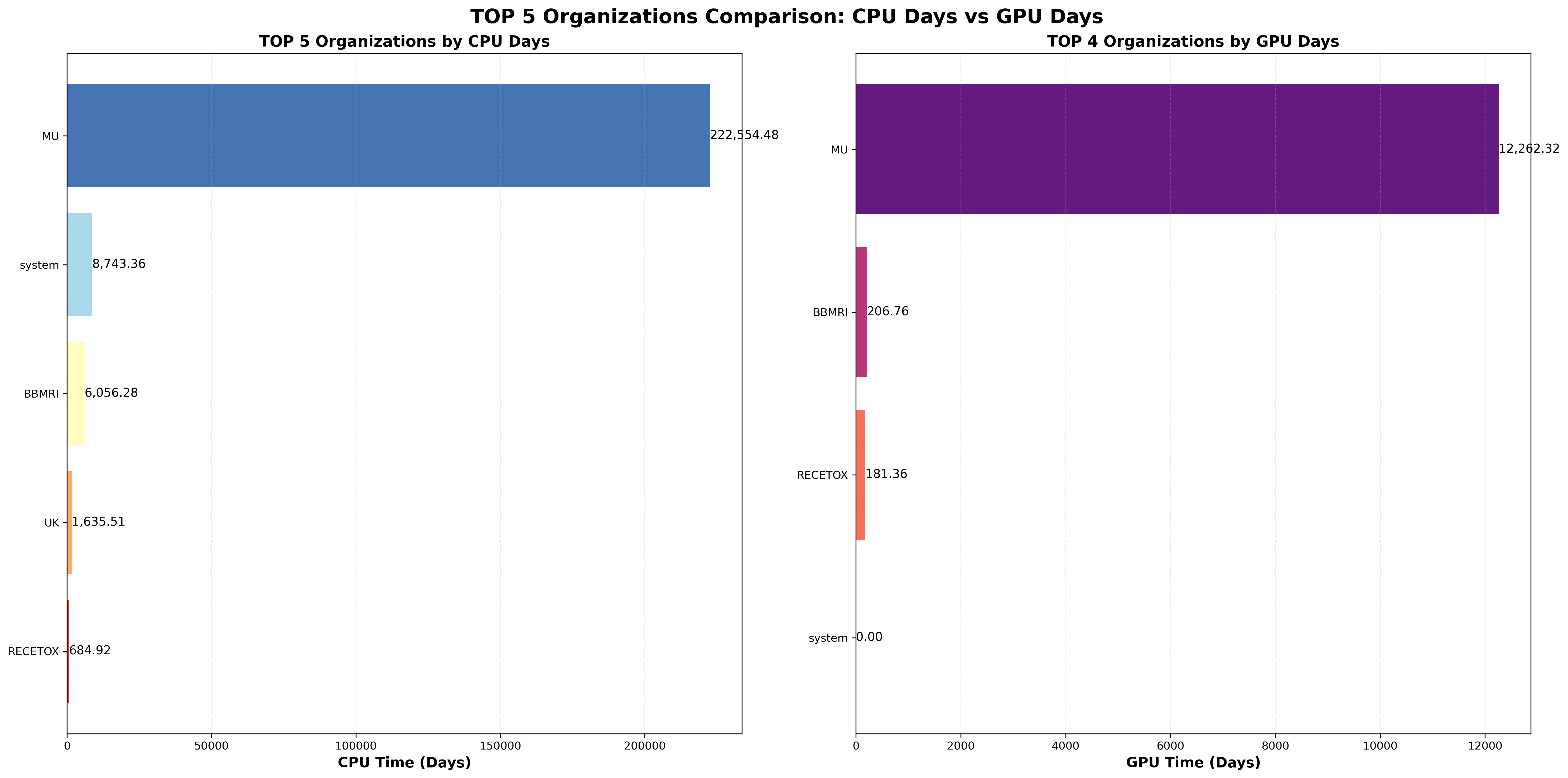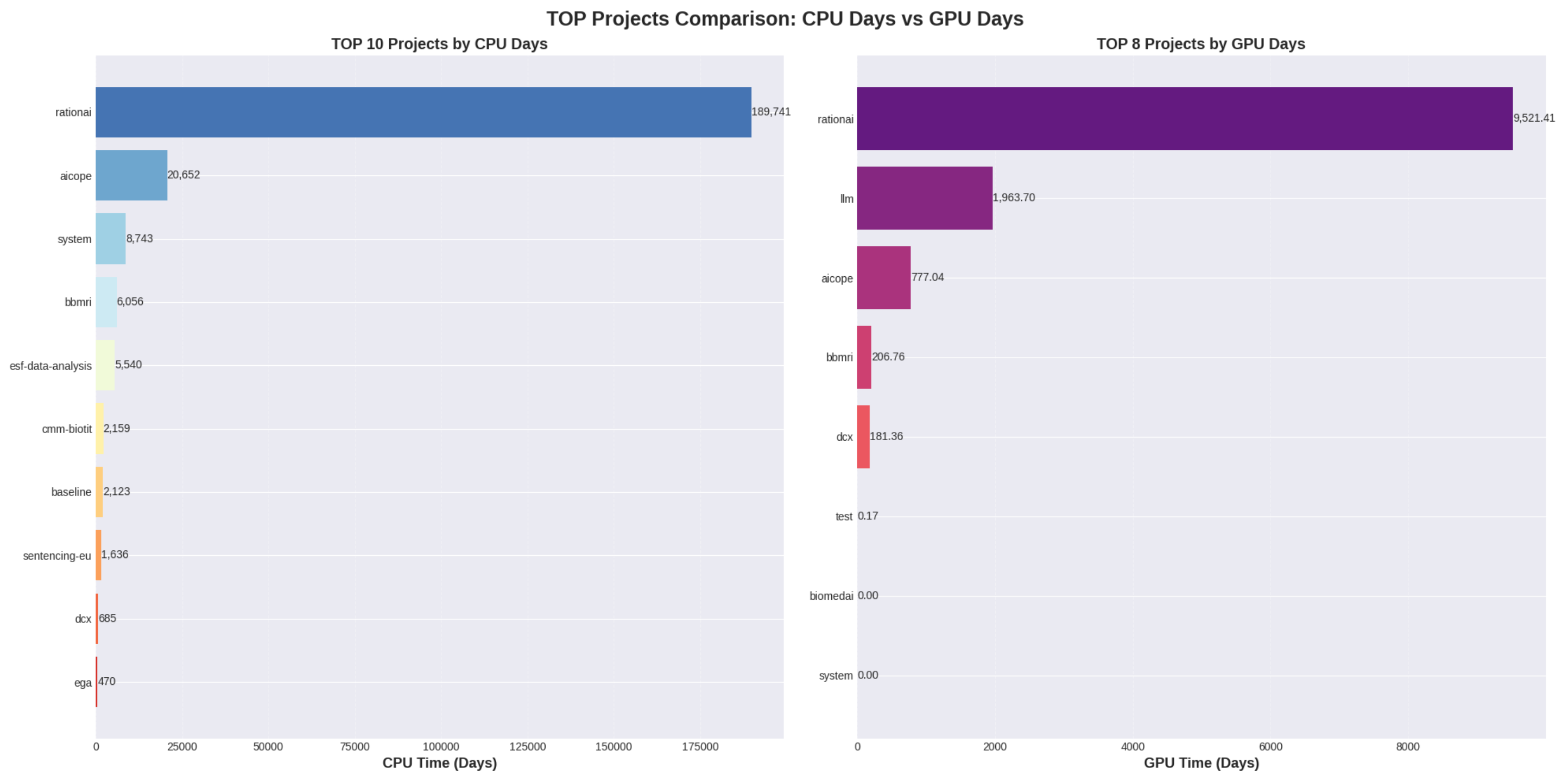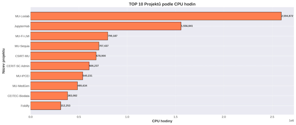 Nejvíce CPU času zkonzumoval projekt rationai (519 CPU let, 79% celkového propočítaného času), na druhém místě byl projekt aicope. Nejvíce GPU času zkonzumoval rovněž projekt rationai (26 GPU let, 75% celkového propočítaného času), na druhém místě byl projekt llm (provoz jazykových modelů).
