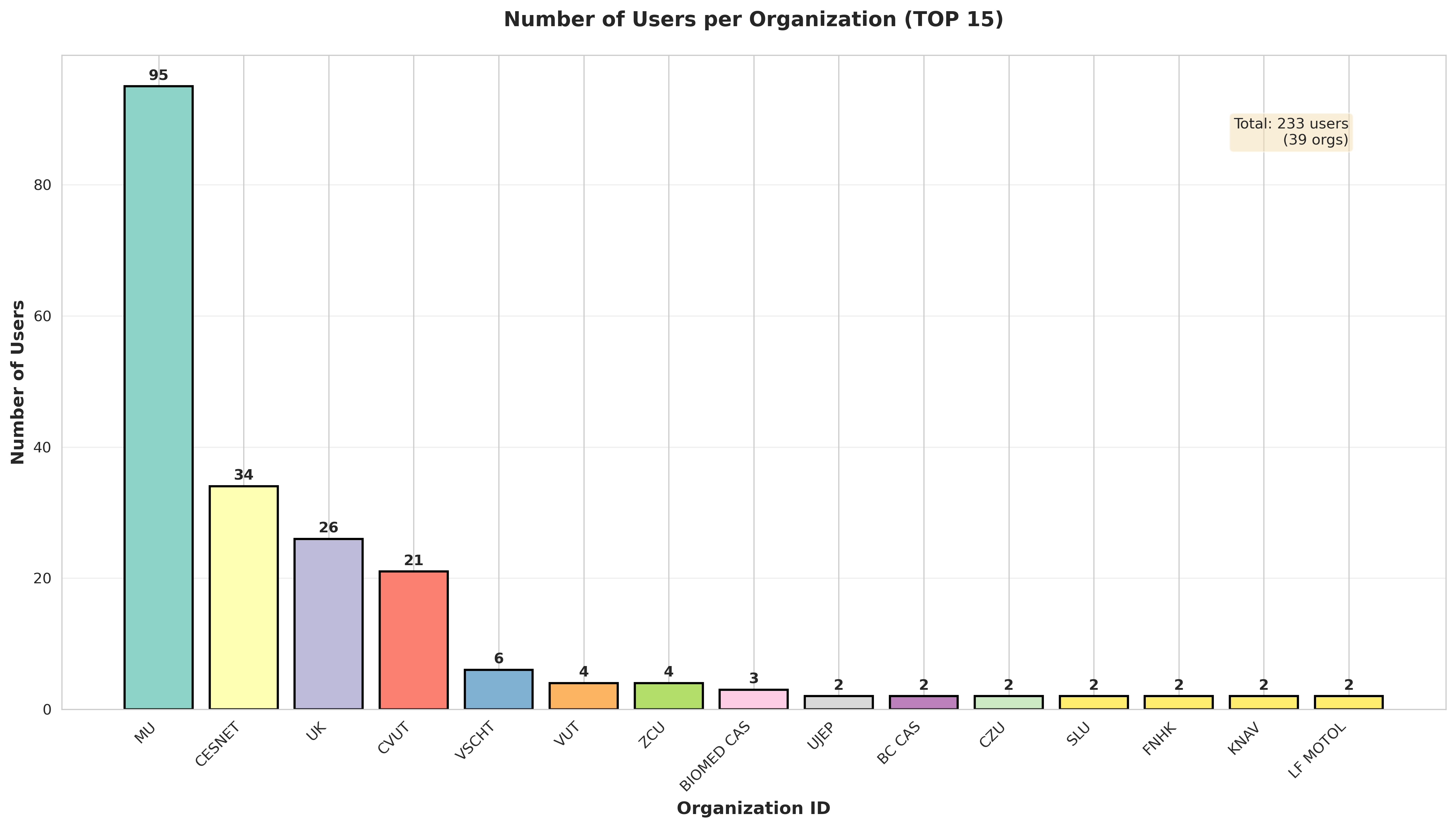 Počet uživatelů z TOP 15 organizací. Mezi uživateli je nejvíce zastoupená Masarykova univerzita (95 uživatelů), CESNET (34 uživatelů), Univerzita Karlova (26 uživatelů) a ČVUT (21 uživatelů).