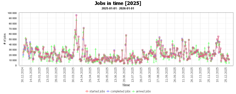 Počet úloh příchozích do plánovače osciloval většinu roku okolo 35 tis. úloh denně. V březnu, dubnu, červnu bylo spuštěno mnoho malých obvykle zřetězených úloh několika málo uživatelů, které výrazně navýšily standardní denní počet úloh. V polovině roku jsme nastavili strop na max. počet úloh v systému na jednoho uživatele.